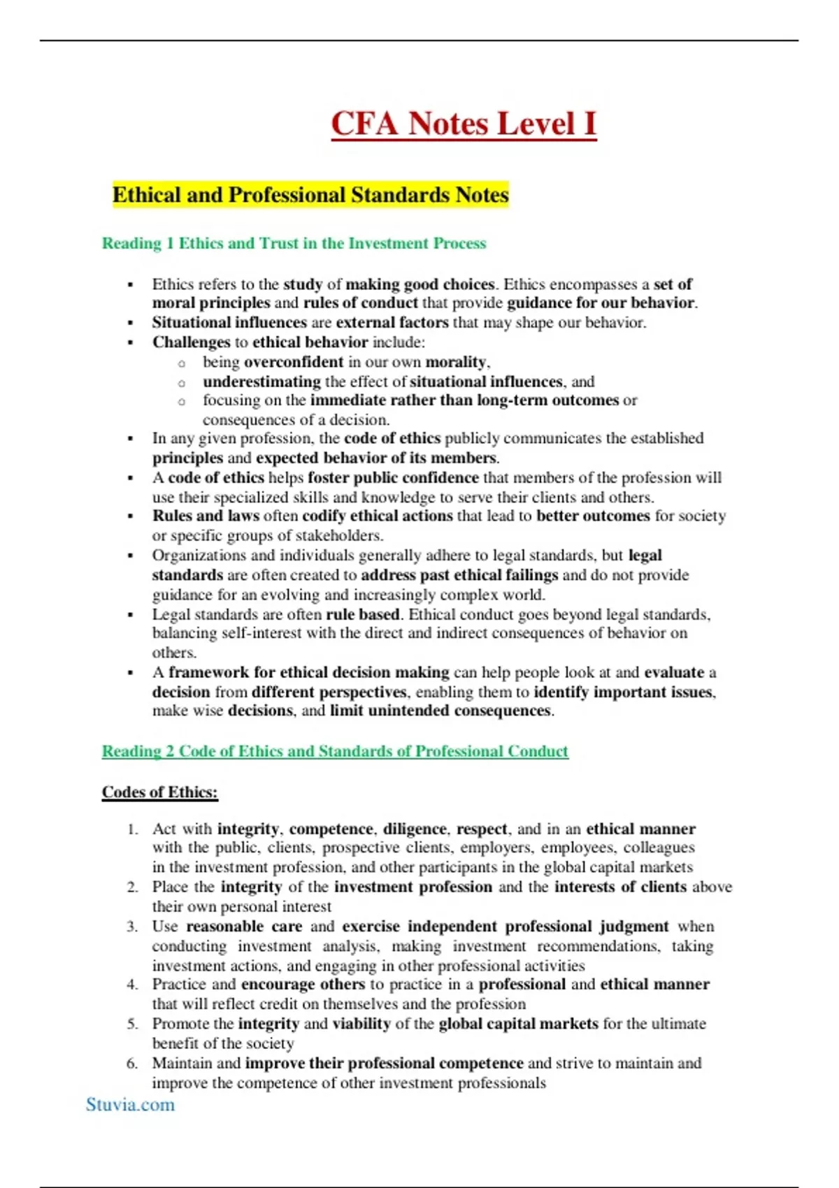 CFA Summary Notes Level I. Ethical and Professional Standards Notes. Ethics refers to the study of making good choices. Ethics encompasses a set of moral principles and rules of conduct that provide guidance for our behavior. Situational influences are external factors that may shape our behavior.