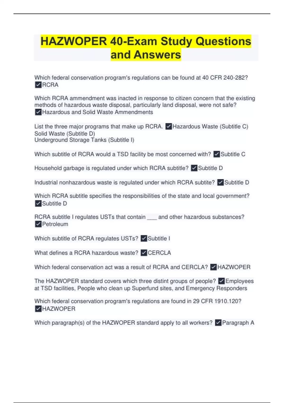 Which federal conservation program's regulations can be found at 40 CFR 240-282? RCRA Which RCRA ammendment was inacted in response to citizen concern that the existing methods of hazardous waste disposal, particularly land disposal, were not safe? Hazardous and Solid Waste Ammendments List the three major programs that make up RCRA. Hazardous Waste (Subtitle C) Solid Waste (Subtitle D) Underground Storage Tanks (Subtitle I) Which subtitle of RCRA would a TSD facility be most concerned with? Subtitle C Household garbage is regulated under which RCRA subtitle? Subtitle D Industrial nonhazardous waste is regulated under which RCRA subtite? Subtitle D