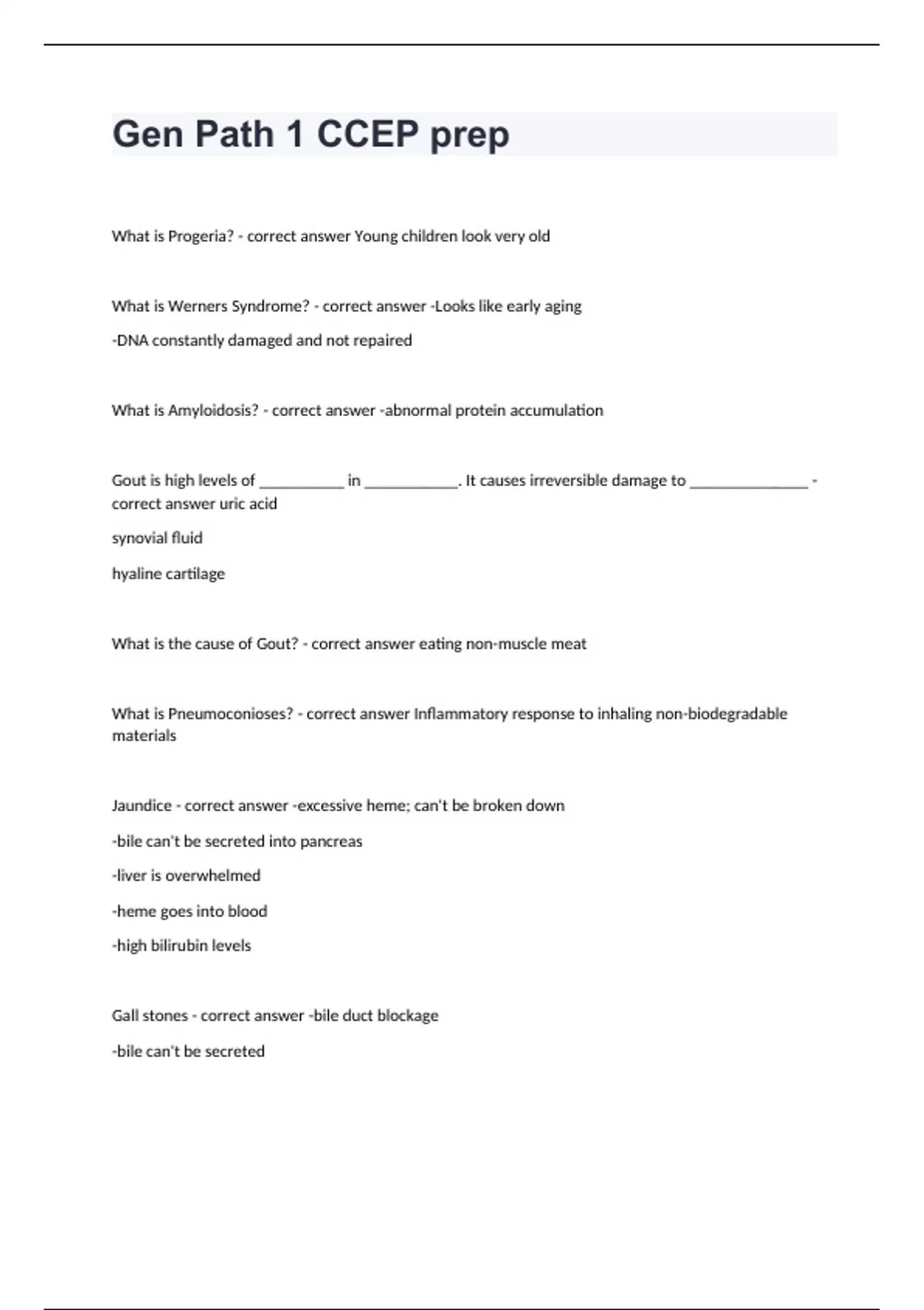 Gen Path 1 CCEP prepWhat is Progeria? - correct answer Young children look very old What is Werners Syndrome? - correct answer -Looks like early aging -DNA constantly damaged and not repaired What is Amyloidosis? - correct answer -abnormal protein accumulation Gout is high levels of __________ in ___________. It causes irreversible damage to ______________ - correct answer uric acid synovial fluid hyaline cartilage What is the cause of Gout? - correct answer eating non-muscle meat What is Pneumoconioses? - correct answer Inflammatory response to inhaling non-biodegradable materials Jaundice - correct answer -excessive heme; can't be broken down -bile can't be secreted into pancreas -liver is overwhelmed -heme goes into blood -high bilirubin levels Gall stones - correct answer -bile duct blockage -bile can't be secreted