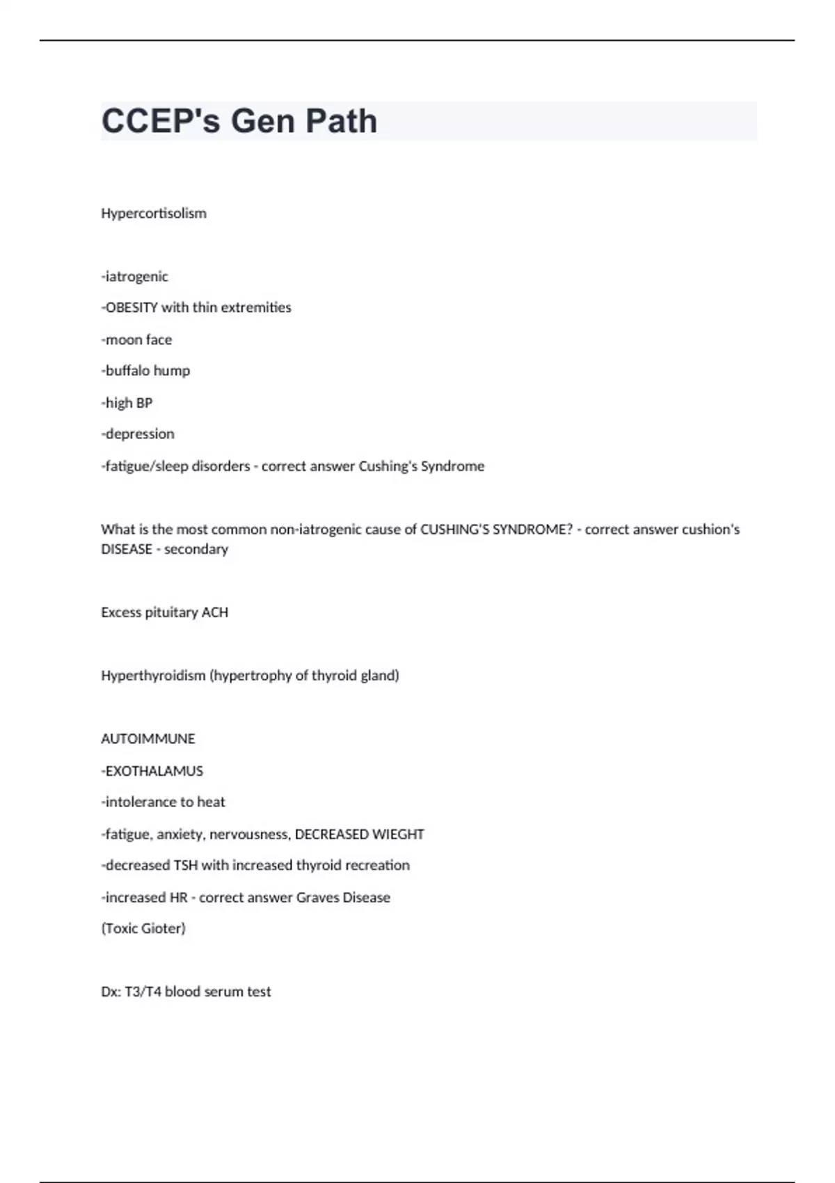 CCEP's Gen PathHypercortisolism -iatrogenic -OBESITY with thin extremities -moon face -buffalo hump -high BP -depression -fatigue/sleep disorders - correct answer Cushing's Syndrome What is the most common non-iatrogenic cause of CUSHING'S SYNDROME? - correct answer cushion's DISEASE - secondary Excess pituitary ACH Hyperthyroidism (hypertrophy of thyroid gland) AUTOIMMUNE -EXOTHALAMUS -intolerance to heat -fatigue, anxiety, nervousness, DECREASED WIEGHT -decreased TSH with increased thyroid recreation -increased HR - correct answer Graves Disease (Toxic Gioter) Dx: T3/T4 blood serum test