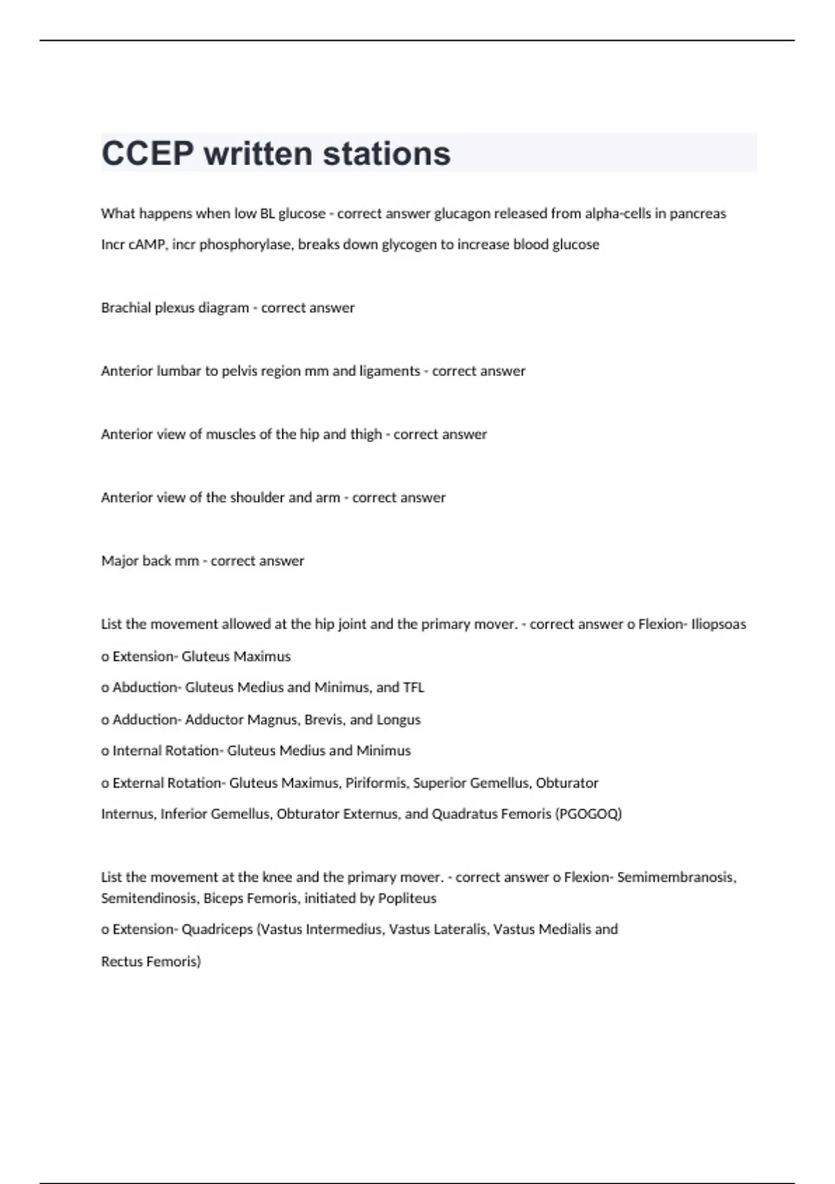 CCEP written stationsWhat happens when low BL glucose - correct answer glucagon released from alpha-cells in pancreas Incr cAMP, incr phosphorylase, breaks down glycogen to increase blood glucose Brachial plexus diagram - correct answer Anterior lumbar to pelvis region mm and ligaments - correct answer Anterior view of muscles of the hip and thigh - correct answer Anterior view of the shoulder and arm - correct answer Major back mm - correct answer List the movement allowed at the hip joint and the primary mover. - correct answer o Flexion- Iliopsoas o Extension- Gluteus Maximus o Abduction- Gluteus Medius and Minimus, and TFL o Adduction- Adductor Magnus, Brevis, and Longus o Internal Rotation- Gluteus Medius and Minimus o External Rotation- Gluteus Maximus, Piriformis, Superior Gemellus, Obturator Internus, Inferior Gemellus, Obturator Externus, and Quadratus Femoris (PGOGOQ) List the movement at the knee and the primary mover. - correct answer o Flexion- Semimembranosis, Semitendinosis, Biceps Femoris, initiated by Popliteus o Extension- Quadriceps (Vastus Intermedius, Vastus Lateralis, Vastus Medialis and Rectus Femoris)
