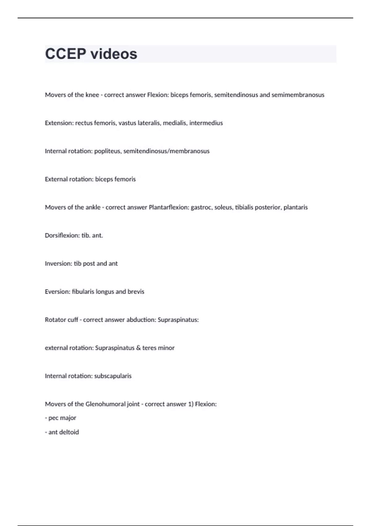 CCEP videos Movers of the knee - correct answer Flexion: biceps femoris, semitendinosus and semimembranosus Extension: rectus femoris, vastus lateralis, medialis, intermedius Internal rotation: popliteus, semitendinosus/membranosus External rotation: biceps femoris Movers of the ankle - correct answer Plantarflexion: gastroc, soleus, tibialis posterior, plantaris Dorsiflexion: tib. ant. Inversion: tib post and ant Eversion: fibularis longus and brevis Rotator cuff - correct answer abduction: Supraspinatus: external rotation: Supraspinatus & teres minor Internal rotation: subscapularis Movers of the Glenohumoral joint - correct answer 1) Flexion: - pec major