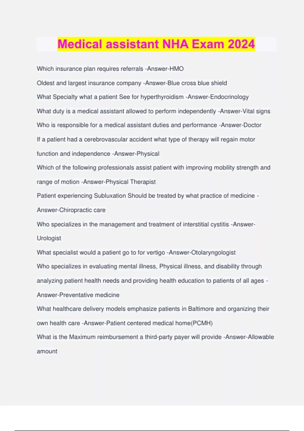 Medical assistant NHA Exam 2024 Which insurance plan requires referrals -Answer-HMO Oldest and largest insurance company -Answer-Blue cross blue shield What Specialty what a patient See for hyperthyroidism -Answer-Endocrinology What duty is a medical assistant allowed to perform independently -Answer-Vital signs Who is responsible for a medical assistant duties and performance -Answer-Doctor If a patient had a cerebrovascular accident what type of therapy will regain motor function and independence -Answer-Physical Which of the following professionals assist patient with improving mobility strength and range of motion -Answer-Physical Therapist Patient experiencing Subluxation Should be treated by what practice of medicine - Answer-Chiropractic care Who specializes in the management and treatment of interstitial cystitis -Answer- Urologist What specialist would a patient go to for vertigo -Answer-Otolaryngologist Who specializes in evaluating mental illness, Physical illness, and disability through analyzing patient health needs and providing health education to patients of all ages - Answer-Preventative medicine What healthcare delivery models emphasize patients in Baltimore and organizing their own health care -Answer-Patient centered medical home(PCMH) What is the Maximum reimbursement a third-party payer will provide -Answer-Allowable amount A provider who sees patients of all ages with a wide variety of acute severe medical conditions -Answer-Family practitioner Accountable Care Organization (ACO) -Answer-Group of physicians, hospitals and other healthcare providers provide coordinated high-quality care to Medicare patients Capitation -Answer-payment to a provider that covers each plan member's health care services for a certain period of time global budget -Answer-Fixed total dollar amount paid annually for all care Health Maintenance Organization (HMO) -Answer-insurance method that focuses on prevention of disease, must see providers from an approved list and requires referrals pay for performance -Answer-A reimbursement plan that links payment to quality and efficiency as an incentive to improve the quality of health care and to reduce costs. Preferred Provider Organization (PPO) -Answer-Doesn't need a primary care physician and can go directly to a specialist without a referral Copayment -Answer-Due at the time of service Coinsurance -Answer-a provision under which both the insured and the insurer share the covered losses Deductible -Answer-Amount you must pay before you begin receiving any benefits from your insurance company Explanation of Benefits (EOB) -Answer-paper document from a payer that shows how the amount of a benefit was determined participating provider -Answer-one who has a contractual agreement with an insurance plan to render care to eligible beneficiaries and then bill the insurance carrier directly Medicare -Answer-65+ government insurance Medicare Part A -Answer-hospital insurance Medicare Part B -Answer-medical insurance Medicare—Part D -Answer-Prescription drug coverage Donut Hole -Answer-Medicare part D coverage gap TRICARE -Answer-U.S. government health insurance plan for all military personnel Medicaid -Answer-A health care payment program sponsored by federal & state governments managed care -Answer-A system that combines the financing and the delivery of appropriate, cost-effective health care services to its members. Workers Compensation -Answer-A form of insurance paid by the employer providing cash benefits to workers injured or disabled in the course of employment. CMS-1500 -Answer-Standard claim form used for outpatient reimbursement hemorrhage -Answer-Excessive or profuse bleeding laceration -Answer-a cut, tear colostomy -Answer-the surgical creation of an artificial excretory opening between the colon and the body surface conjunctiva -Answer-The delicate membrane that lines the eyelids and covers the exposed surface of the eye. Diverticula -Answer-abnormal side pockets in the intestinal wall metastasis -Answer-The spread of cancer cells beyond their original site villus -Answer-folded projection that increases the surface area of the walls of the small intestine ganglion -Answer-collection of nerve cell bodies in the peripheral nervous system