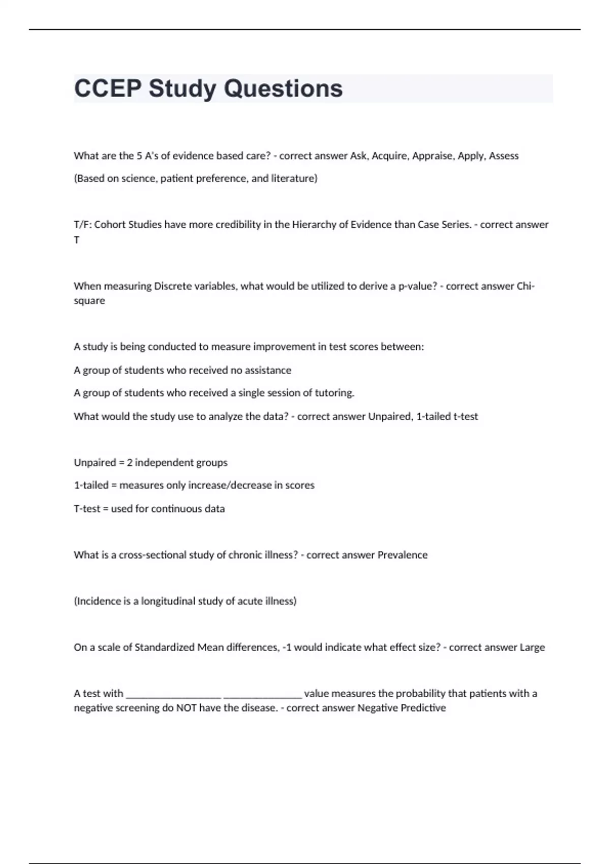 CCEP Study Questions What are the 5 A's of evidence based care? - correct answer Ask, Acquire, Appraise, Apply, Assess (Based on science, patient preference, and literature) T/F: Cohort Studies have more credibility in the Hierarchy of Evidence than Case Series. - correct answer T When measuring Discrete variables, what would be utilized to derive a p-value? - correct answer Chi-square A study is being conducted to measure improvement in test scores between: A group of students who received no assistance A group of students who received a single session of tutoring. What would the study use to analyze the data? - correct answer Unpaired, 1-tailed t-test Unpaired = 2 independent groups 1-tailed = measures only increase/decrease in scores T-test = used for continuous data What is a cross-sectional study of chronic illness? - correct answer Prevalence (Incidence is a longitudinal study of acute illness) On a scale of Standardized Mean differences, -1 would indicate what effect size? - correct answer Large A test with _________________ ______________ value measures the probability that patients with a negative screening do NOT have the disease. - correct answer Negative Predictive