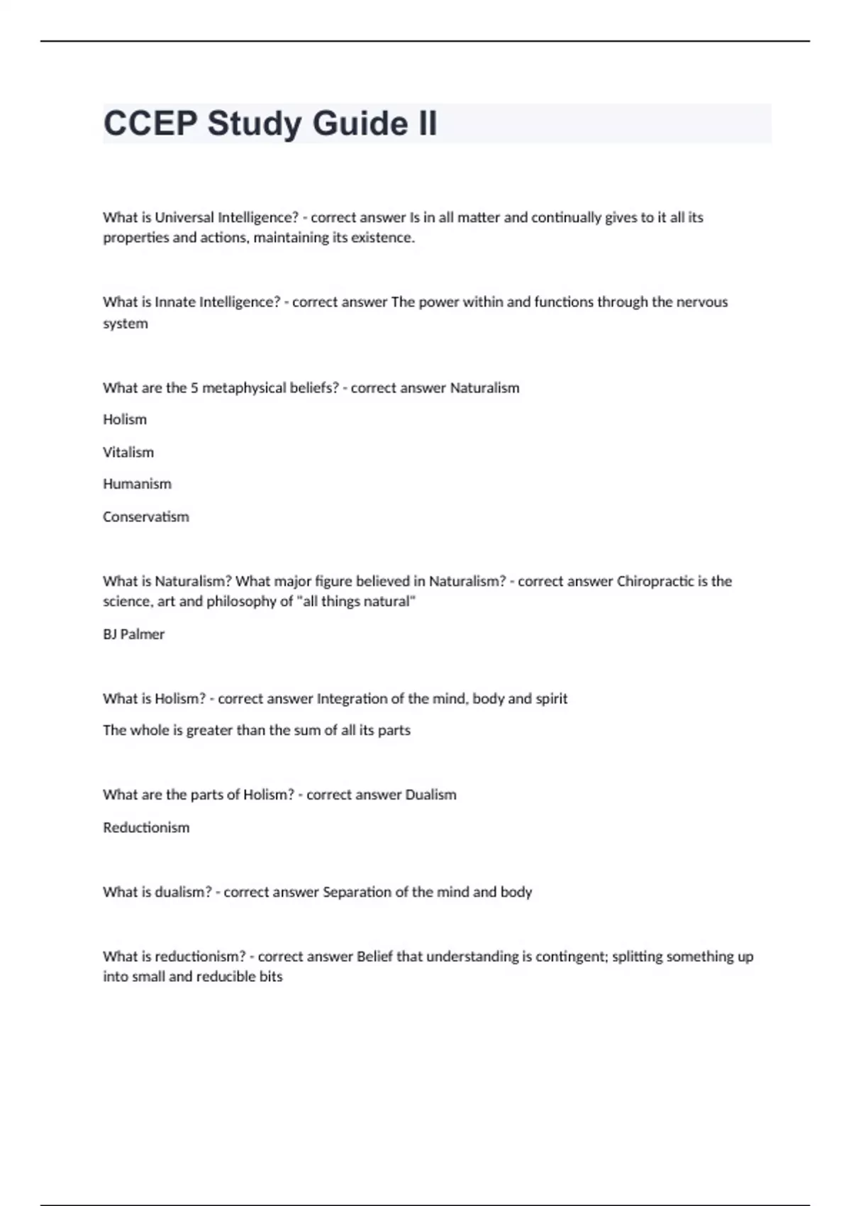 CCEP Study Guide II What is Universal Intelligence? - correct answer Is in all matter and continually gives to it all its properties and actions, maintaining its existence. What is Innate Intelligence? - correct answer The power within and functions through the nervous system What are the 5 metaphysical beliefs? - correct answer Naturalism Holism Vitalism Humanism Conservatism What is Naturalism? What major figure believed in Naturalism? - correct answer Chiropractic is the science, art and philosophy of "all things natural" BJ Palmer What is Holism? - correct answer Integration of the mind, body and spirit The whole is greater than the sum of all its parts What are the parts of Holism? - correct answer Dualism Reductionism What is dualism? - correct answer Separation of the mind and body What is reductionism? - correct answer Belief that understanding is contingent; splitting something up into small and reducible bits What is Vitalism? - correct answer All living organisms have the inherent ubiquitous property of self healing What are the types of Vitalism? (2) - correct answer Modern (supernatural soul) Radical (Complex adaptive systems have an organizing principle that is an emergent property of the system; enables self regulation and self repair) What is Humanism? - correct answer We should respect the fundamental worth and dignity of all persons including their individual values and expectations What is Conservatism? - correct answer Chiropractic care relies on the inherent, recuperative powers of the body What are signs and symptoms of Cushing's Syndrome? - correct answer - Upper body obesity with thin arms and legs - Buffalo hump - Red, round face (moon face) - High blood sugar - High blood BP - Severe depression/emotional instability - Fatigue/Sleep disorders What is the most common cause of Non-iatrogenic Cushing's Syndrome? - correct answer Excess Pituitary ACH What is Ketosis? - correct answer Natural process that occurs when fats are converted into energy by the body (when there is not enough glucose (CHO) to provide for body's energy needs. What is Orthostatic Hypotension? - correct answer A sudden fall in blood pressure (greater than 20/10mmHg drop) that occurs when a person assumes standing position after a prolonged period of rest What are the stages of disc herniation? - correct answer Stage 1: Disc Protrusion