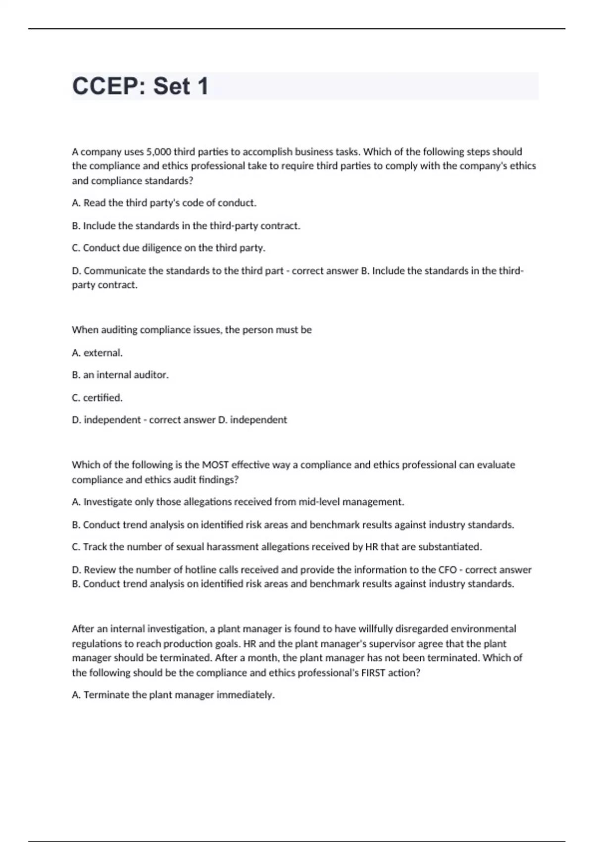 CCEP: Set 1 A company uses 5,000 third parties to accomplish business tasks. Which of the following steps should the compliance and ethics professional take to require third parties to comply with the company's ethics and compliance standards? A. Read the third party's code of conduct. B. Include the standards in the third-party contract. C. Conduct due diligence on the third party. D. Communicate the standards to the third part - correct answer B. Include the standards in the third-party contract. When auditing compliance issues, the person must be A. external. B. an internal auditor. C. certified. D. independent - correct answer D. independent Which of the following is the MOST effective way a compliance and ethics professional can evaluate compliance and ethics audit findings? A. Investigate only those allegations received from mid-level management. B. Conduct trend analysis on identified risk areas and benchmark results against industry standards. C. Track the number of sexual harassment allegations received by HR that are substantiated. D. Review the number of hotline calls received and provide the information to the CFO - correct answer B. Conduct trend analysis on identified risk areas and benchmark results against industry standards. After an internal investigation, a plant manager is found to have willfully disregarded environmental regulations to reach production goals. HR and the plant manager's supervisor agree that the plant manager should be terminated. After a month, the plant manager has not been terminated. Which of the following should be the compliance and ethics professional's FIRST action? A. Terminate the plant manager immediately.