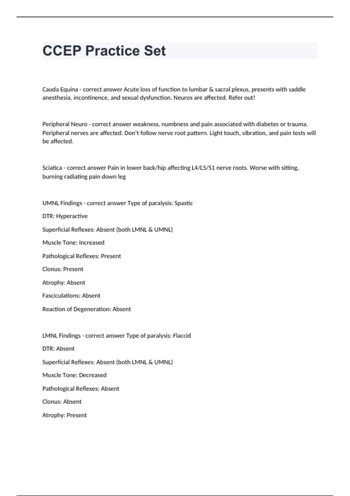 CCEP Practice Set Cauda Equina - correct answer Acute loss of function to lumbar & sacral plexus, presents with saddle anesthesia, incontinence, and sexual dysfunction. Neuros are affected. Refer out! Peripheral Neuro - correct answer weakness, numbness and pain associated with diabetes or trauma. Peripheral nerves are affected. Don't follow nerve root pattern. Light touch, vibration, and pain tests will be affected. Sciatica - correct answer Pain in lower back/hip affecting L4/L5/S1 nerve roots. Worse with sitting, burning radiating pain down leg UMNL Findings - correct answer Type of paralysis: Spastic DTR: Hyperactive Superficial Reflexes: Absent (both LMNL & UMNL) Muscle Tone: Increased Pathological Reflexes: Present Clonus: Present Atrophy: Absent Fasciculations: Absent Reaction of Degeneration: Absent