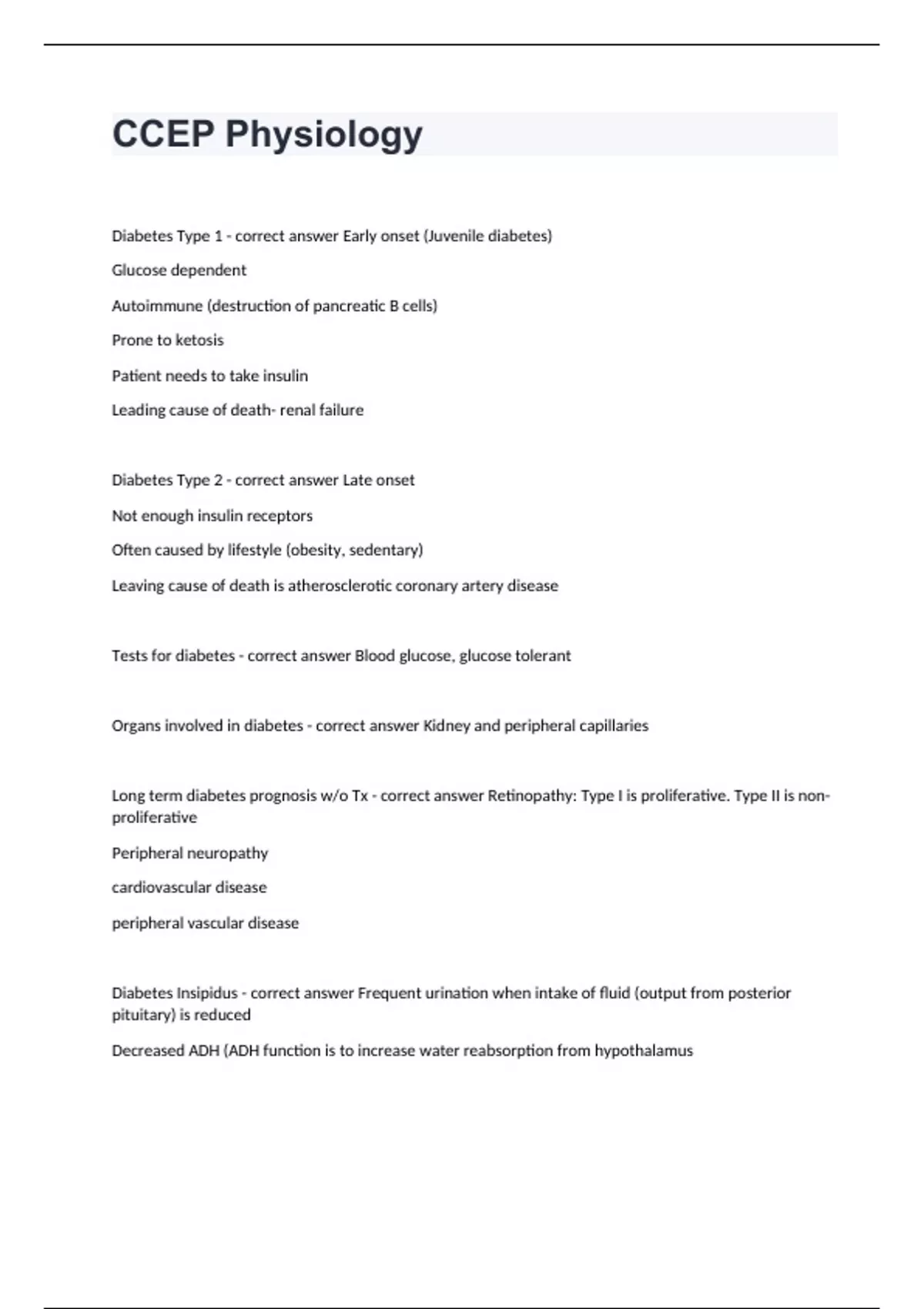 CCEP Physiology Diabetes Type 1 - correct answer Early onset (Juvenile diabetes) Glucose dependent Autoimmune (destruction of pancreatic B cells) Prone to ketosis Patient needs to take insulin Leading cause of death- renal failure Diabetes Type 2 - correct answer Late onset Not enough insulin receptors Often caused by lifestyle (obesity, sedentary) Leaving cause of death is atherosclerotic coronary artery disease Tests for diabetes - correct answer Blood glucose, glucose tolerant Organs involved in diabetes - correct answer Kidney and peripheral capillaries Long term diabetes prognosis w/o Tx - correct answer Retinopathy: Type I is proliferative. Type II is non-proliferative Peripheral neuropathy cardiovascular disease peripheral vascular disease Diabetes Insipidus - correct answer Frequent urination when intake of fluid (output from posterior pituitary) is reduced Decreased ADH (ADH function is to increase water reabsorption from hypothalamus