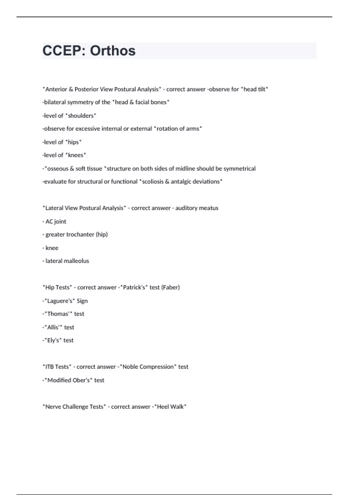CCEP: *Anterior & Posterior View Postural Analysis* - correct answer -observe for *head tilt* -bilateral symmetry of the *head & facial bones* -level of *shoulders* -observe for excessive internal or external *rotation of arms* -level of *hips* -level of *knees* -*osseous & soft tissue *structure on both sides of midline should be symmetrical -evaluate for structural or functional *scoliosis & antalgic deviations* *Lateral View Postural Analysis* - correct answer - auditory meatus - AC joint - greater trochanter (hip) - knee - lateral malleolus *Hip Tests* - correct answer -*Patrick's* test (Faber) -*Laguere's* Sign -*Thomas'* test -*Allis'* test -*Ely's* test *ITB Tests* - correct answer -*Noble Compression* test -*Modified Ober's* test *Nerve Challenge Tests* - correct answer -*Heel Walk*