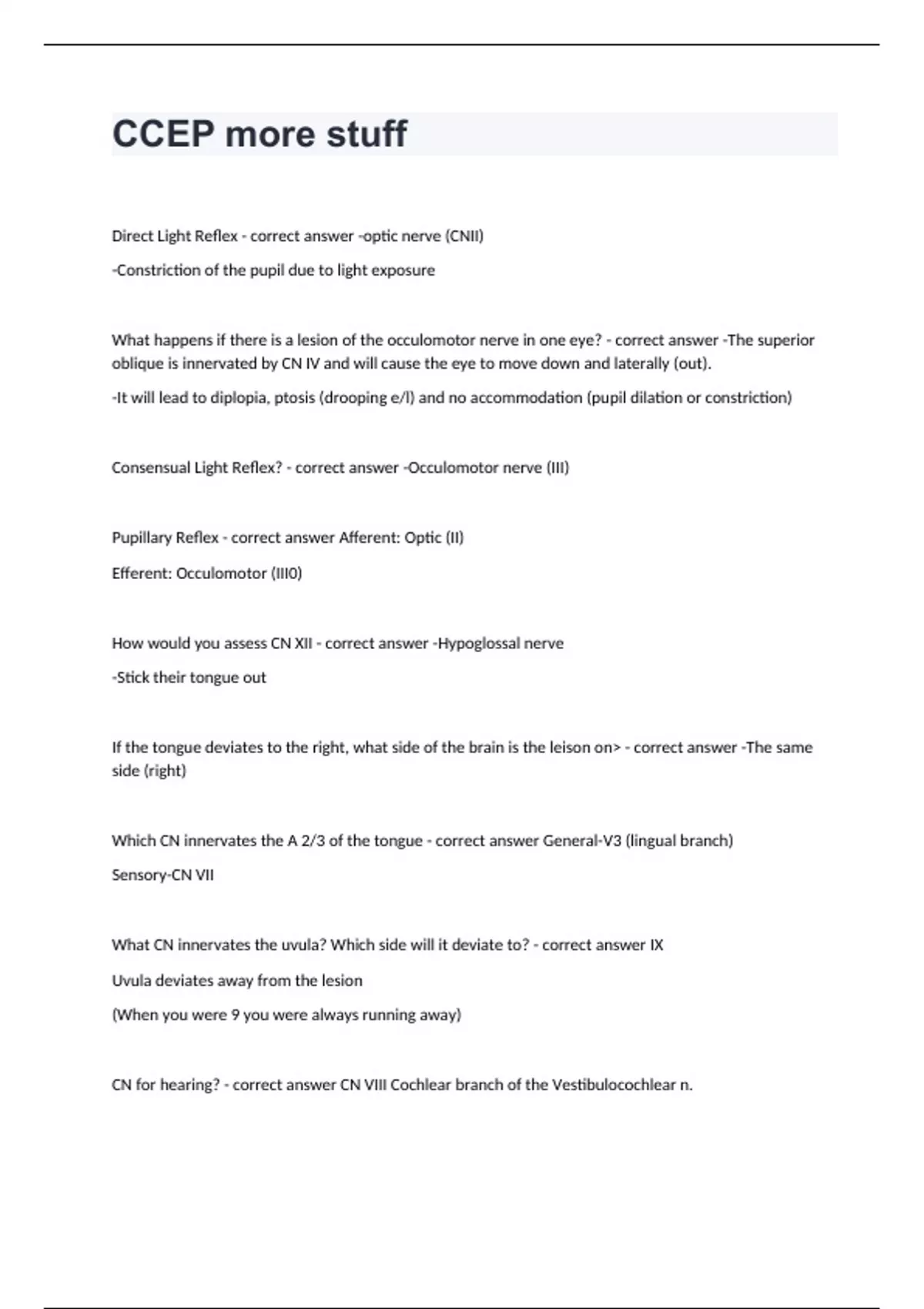 CCEP more stuffDirect Light Reflex - correct answer -optic nerve (CNII) -Constriction of the pupil due to light exposure What happens if there is a lesion of the occulomotor nerve in one eye? - correct answer -The superior oblique is innervated by CN IV and will cause the eye to move down and laterally (out). -It will lead to diplopia, ptosis (drooping e/l) and no accommodation (pupil dilation or constriction) Consensual Light Reflex? - correct answer -Occulomotor nerve (III) Pupillary Reflex - correct answer Afferent: Optic (II) Efferent: Occulomotor (III0) How would you assess CN XII - correct answer -Hypoglossal nerve -Stick their tongue out If the tongue deviates to the right, what side of the brain is the leison on> - correct answer -The same side (right) Which CN innervates the A 2/3 of the tongue - correct answer General-V3 (lingual branch) Sensory-CN VII What CN innervates the uvula? Which side will it deviate to? - correct answer IX Uvula deviates away from the lesion (When you were 9 you were always running away) CN for hearing? - correct answer CN VIII Cochlear branch of the Vestibulocochlear n.
