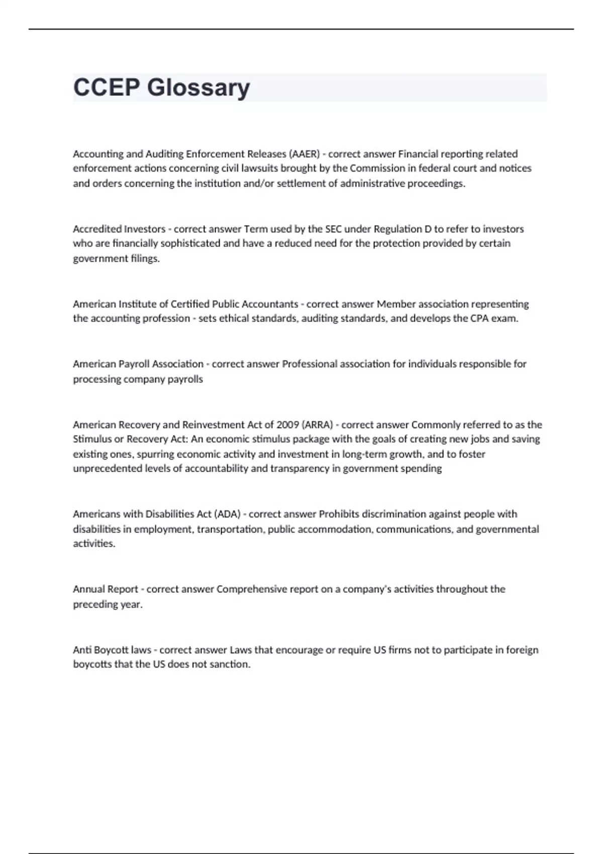CCEP GlossaryAccounting and Auditing Enforcement Releases (AAER) - correct answer Financial reporting related enforcement actions concerning civil lawsuits brought by the Commission in federal court and notices and orders concerning the institution and/or settlement of administrative proceedings. Accredited Investors - correct answer Term used by the SEC under Regulation D to refer to investors who are financially sophisticated and have a reduced need for the protection provided by certain government filings. American Institute of Certified Public Accountants - correct answer Member association representing the accounting profession - sets ethical standards, auditing standards, and develops the CPA exam. American Payroll Association - correct answer Professional association for individuals responsible for processing company payrolls American Recovery and Reinvestment Act of 2009 (ARRA) - correct answer Commonly referred to as the Stimulus or Recovery Act: An economic stimulus package with the goals of creating new jobs and saving existing ones, spurring economic activity and investment in long-term growth, and to foster unprecedented levels of accountability and transparency in government spending Americans with Disabilities Act (ADA) - correct answer Prohibits discrimination against people with disabilities in employment, transportation, public accommodation, communications, and governmental activities. Annual Report - correct answer Comprehensive report on a company's activities throughout the preceding year. Anti Boycott laws - correct answer Laws that encourage or require US firms not to participate in foreign boycotts that the US does not sanction.