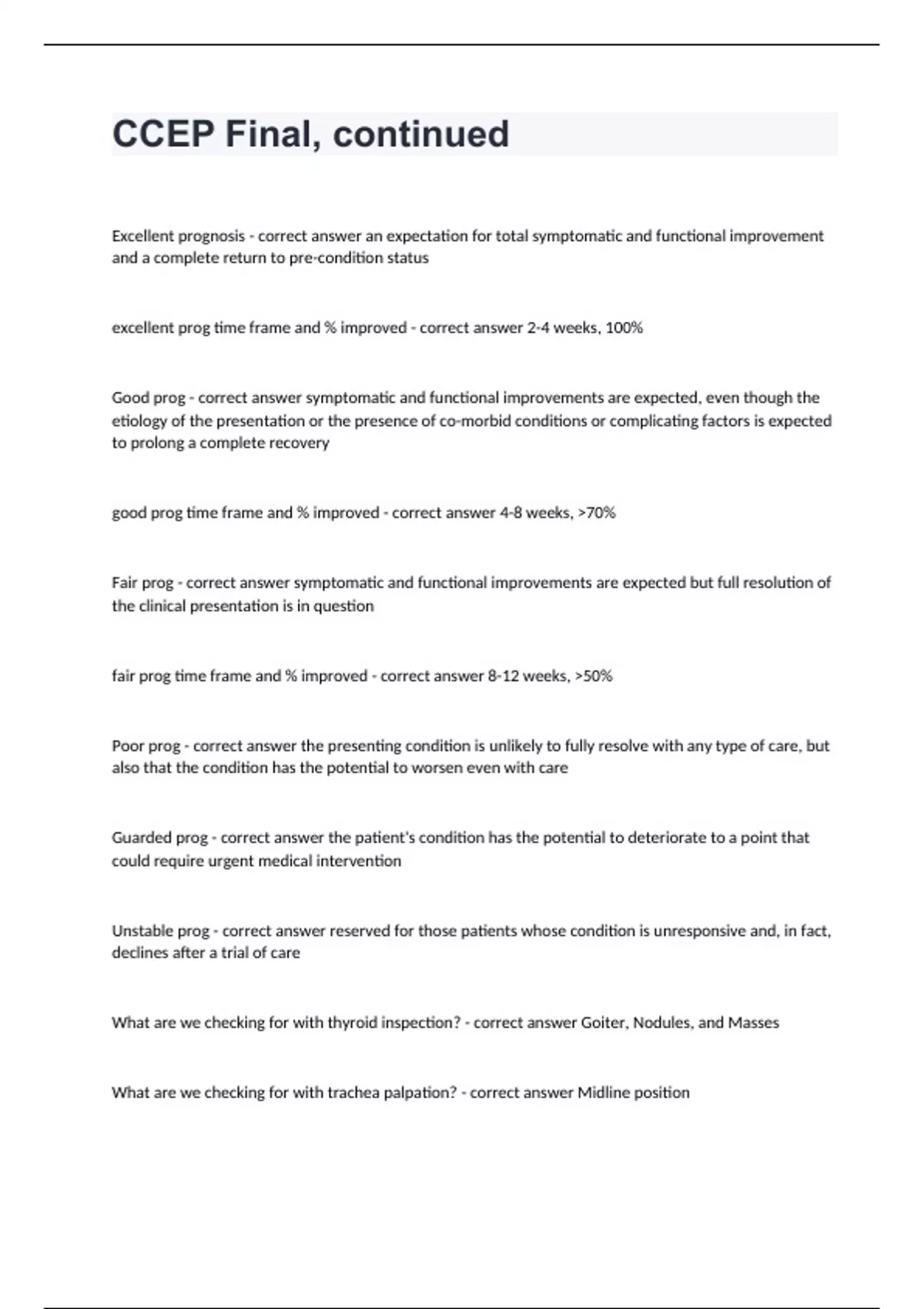 CCEP Final, continuedExcellent prognosis - correct answer an expectation for total symptomatic and functional improvement and a complete return to pre-condition status excellent prog time frame and % improved - correct answer 2-4 weeks, 100% Good prog - correct answer symptomatic and functional improvements are expected, even though the etiology of the presentation or the presence of co-morbid conditions or complicating factors is expected to prolong a complete recovery good prog time frame and % improved - correct answer 4-8 weeks, >70% Fair prog - correct answer symptomatic and functional improvements are expected but full resolution of the clinical presentation is in question fair prog time frame and % improved - correct answer 8-12 weeks, >50% Poor prog - correct answer the presenting condition is unlikely to fully resolve with any type of care, but also that the condition has the potential to worsen even with care Guarded prog - correct answer the patient's condition has the potential to deteriorate to a point that could require urgent medical intervention Unstable prog - correct answer reserved for those patients whose condition is unresponsive and, in fact, declines after a trial of care What are we checking for with thyroid inspection? - correct answer Goiter, Nodules, and Masses What are we checking for with trachea palpation? - correct answer Midline position