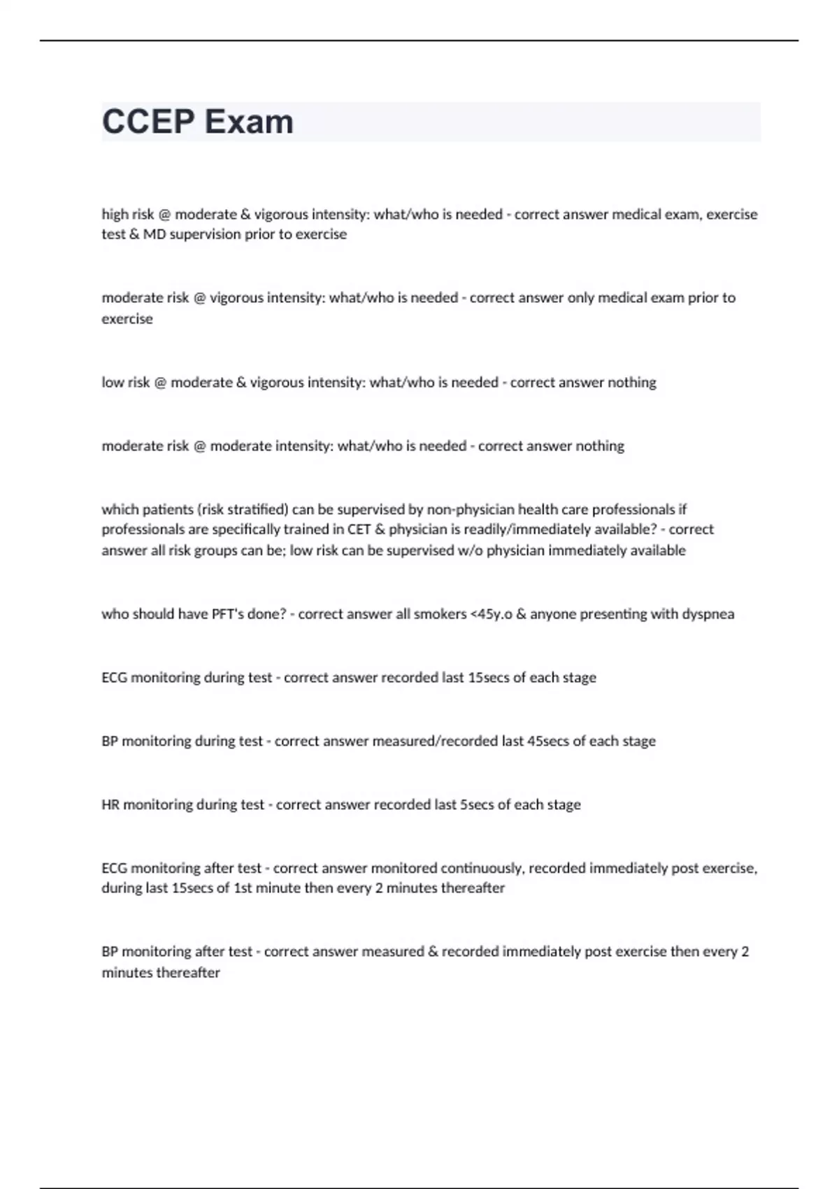 CCEP Exam high risk @ moderate & vigorous intensity: what/who is needed - correct answer medical exam, exercise test & MD supervision prior to exercise moderate risk @ vigorous intensity: what/who is needed - correct answer only medical exam prior to exercise low risk @ moderate & vigorous intensity: what/who is needed - correct answer nothing moderate risk @ moderate intensity: what/who is needed - correct answer nothing which patients (risk stratified) can be supervised by non-physician health care professionals if professionals are specifically trained in CET & physician is readily/immediately available? - correct answer all risk groups can be; low risk can be supervised w/o physician immediately available who should have PFT's done? - correct answer all smokers <45y.o & anyone presenting with dyspnea ECG monitoring during test - correct answer recorded last 15secs of each stage BP monitoring during test - correct answer measured/recorded last 45secs of each stage HR monitoring during test - correct answer recorded last 5secs of each stage ECG monitoring after test - correct answer monitored continuously, recorded immediately post exercise, during last 15secs of 1st minute then every 2 minutes thereafter BP monitoring after test - correct answer measured & recorded immediately post exercise then every 2 minutes thereafter
