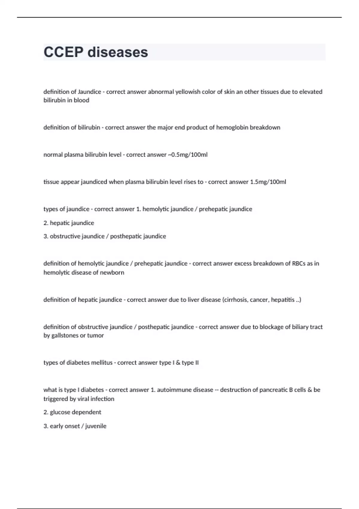 CCEP diseasesdefinition of Jaundice - correct answer abnormal yellowish color of skin an other tissues due to elevated bilirubin in blood definition of bilirubin - correct answer the major end product of hemoglobin breakdown normal plasma bilirubin level - correct answer ~0.5mg/100ml tissue appear jaundiced when plasma bilirubin level rises to - correct answer 1.5mg/100ml types of jaundice - correct answer 1. hemolytic jaundice / prehepatic jaundice 2. hepatic jaundice 3. obstructive jaundice / posthepatic jaundice definition of hemolytic jaundice / prehepatic jaundice - correct answer excess breakdown of RBCs as in hemolytic disease of newborn definition of hepatic jaundice - correct answer due to liver disease (cirrhosis, cancer, hepatitis ..) definition of obstructive jaundice / posthepatic jaundice - correct answer due to blockage of biliary tract by gallstones or tumor types of diabetes mellitus - correct answer type I & type II what is type I diabetes - correct answer 1. autoimmune disease -- destruction of pancreatic B cells & be triggered by viral infection 2. glucose dependent 3. early onset / juvenile