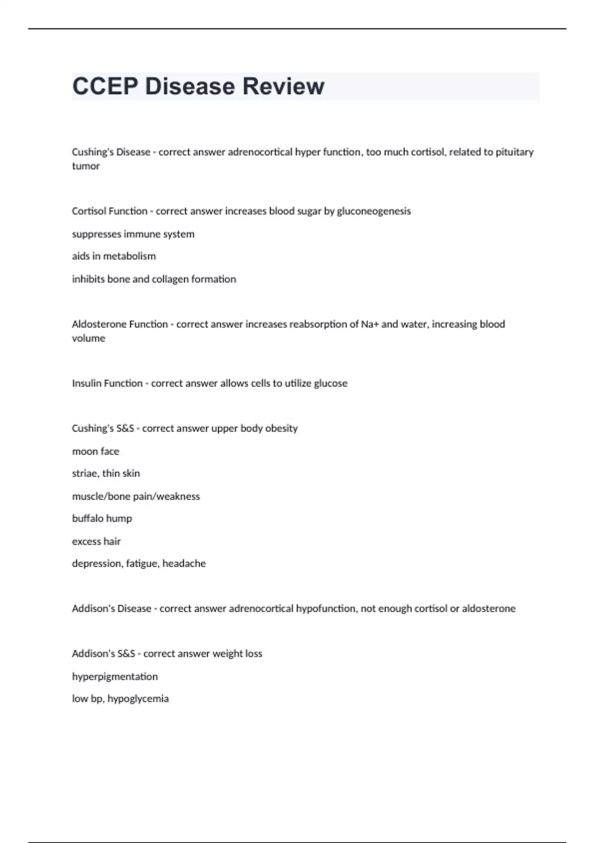 CCEP Disease ReviewCushing's Disease - correct answer adrenocortical hyper function, too much cortisol, related to pituitary tumor Cortisol Function - correct answer increases blood sugar by gluconeogenesis suppresses immune system aids in metabolism inhibits bone and collagen formation Aldosterone Function - correct answer increases reabsorption of Na+ and water, increasing blood volume Insulin Function - correct answer allows cells to utilize glucose Cushing's S&S - correct answer upper body obesity moon face striae, thin skin muscle/bone pain/weakness buffalo hump excess hair depression, fatigue, headache Addison's Disease - correct answer adrenocortical hypofunction, not enough cortisol or aldosterone Addison's S&S - correct answer weight loss hyperpigmentation