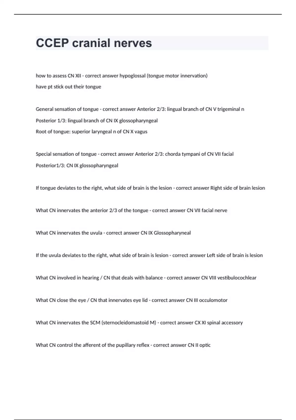 CCEP cranial nerves questions with answers 100%