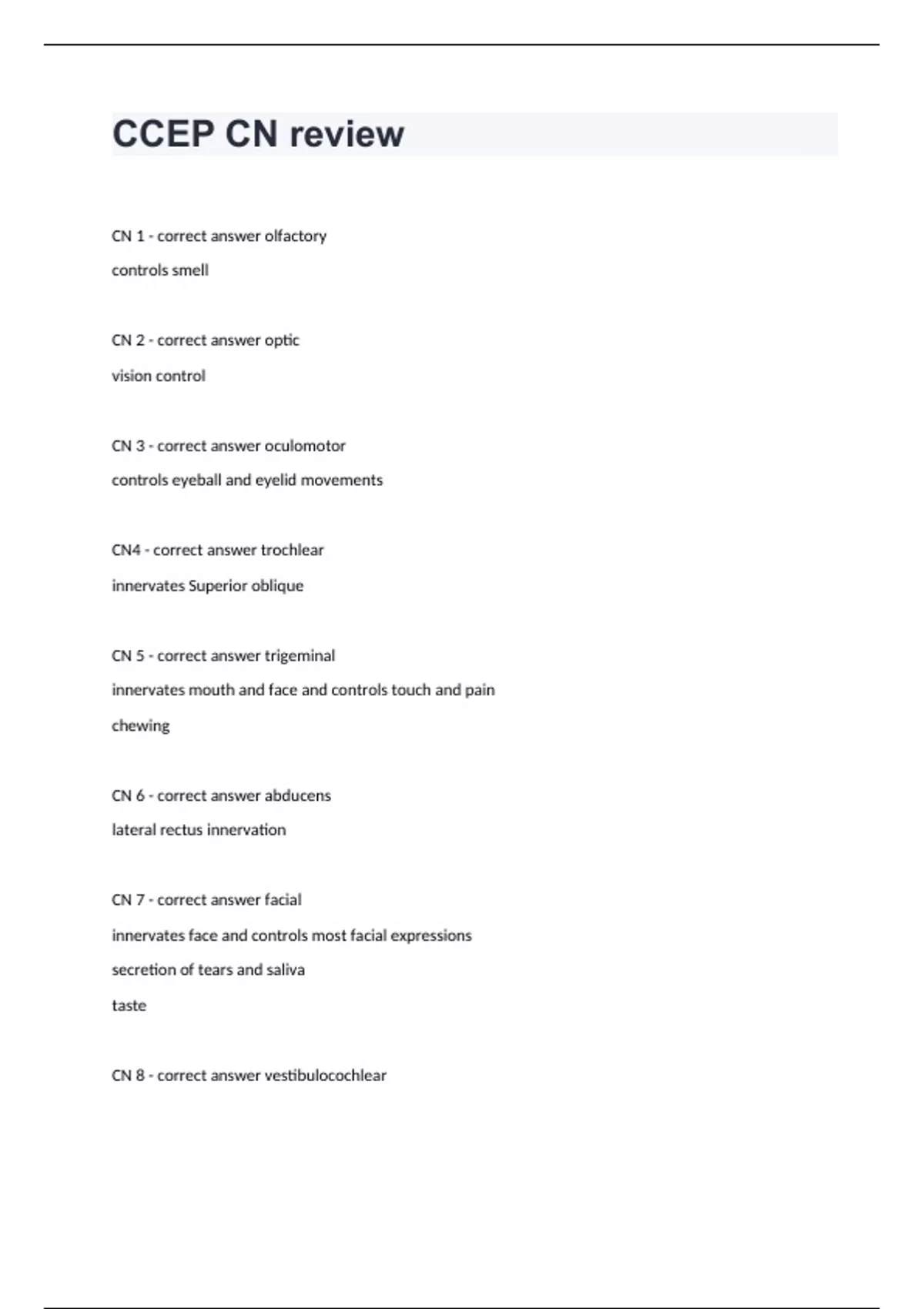 CCEP CN reviewCN 1 - correct answer olfactory controls smell CN 2 - correct answer optic vision control CN 3 - correct answer oculomotor controls eyeball and eyelid movements CN4 - correct answer trochlear innervates Superior oblique CN 5 - correct answer trigeminal innervates mouth and face and controls touch and pain chewing CN 6 - correct answer abducens lateral rectus innervation CN 7 - correct answer facial innervates face and controls most facial expressions secretion of tears and saliva taste CN 8 - correct answer vestibulocochlear