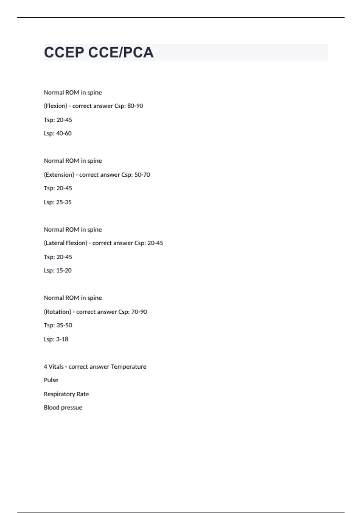 CCEP CCE/PCANormal ROM in spine (Flexion) - correct answer Csp: 80-90 Tsp: 20-45 Lsp: 40-60 Normal ROM in spine (Extension) - correct answer Csp: 50-70 Tsp: 20-45 Lsp: 25-35 Normal ROM in spine (Lateral Flexion) - correct answer Csp: 20-45 Tsp: 20-45 Lsp: 15-20 Normal ROM in spine (Rotation) - correct answer Csp: 70-90 Tsp: 35-50 Lsp: 3-18 4 Vitals - correct answer Temperature Pulse Respiratory Rate Blood pressue Average and range of temperature - correct answer Average: 98.6 degrees F Range: 96.4-99.1 degrees F Average and range of pulse - correct answer Average: 74-76 bpm Range: 60-100 bpm Range of respiratory rate - correct answer 10-20 cycles per min Pulse to respiratory ratio = 4:1 Normal range of blood pressure - correct answer <120/<80 mmHg Stages of hypertension - correct answer Normal: <120 AND <80 mmHg Elevated: 120-129/ AND <80 mmHg Stage 1: 130-139/ OR 80-89 mmHg Stage 2: >140 or >90 mmHg Hypertensive crisis: >180 AND/OR >120 mmHg UMNL VS LMNL - correct answer UMNL: - DTR present - Spastic paralysis - Increased tone - Pathological reflex present - Superficial reflex absent LMNL: - DTR absent - Flaccid paralysis - Decreased tone - Pathological reflex absent
