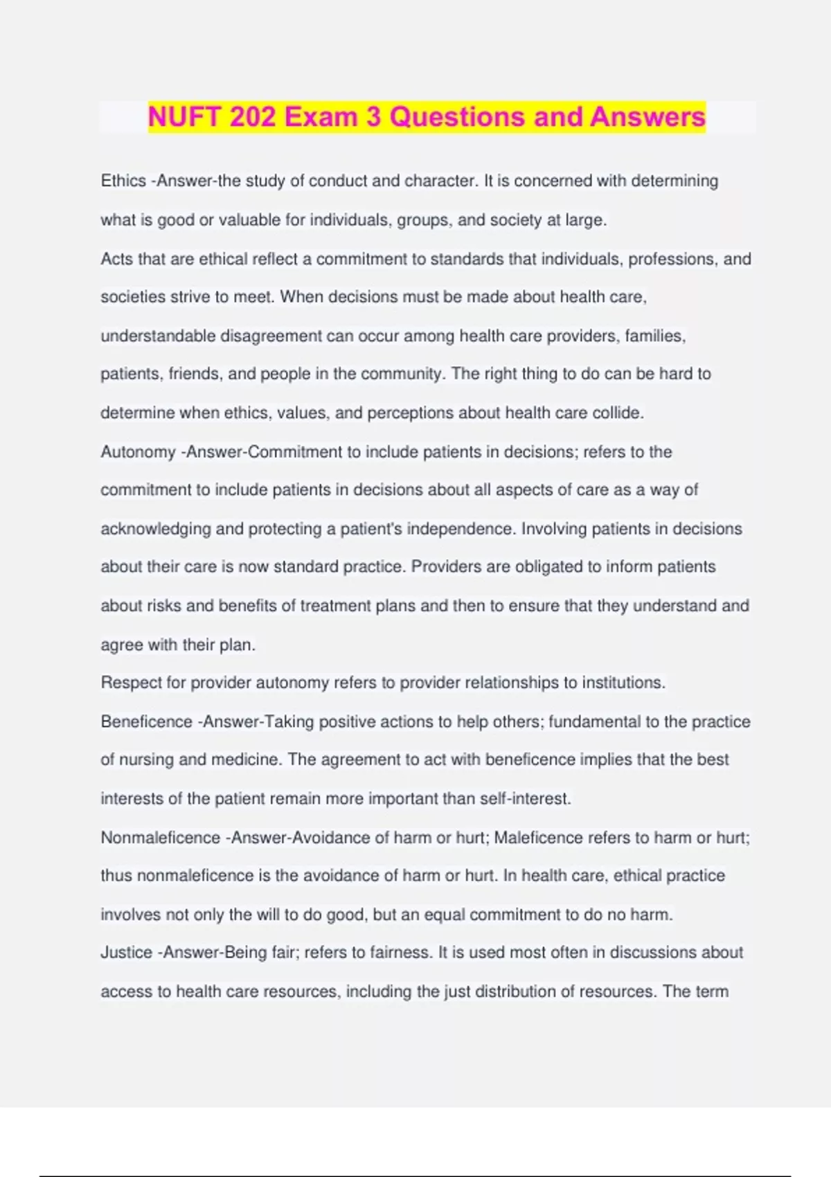NUFT 202 Exam 3 Questions and Answers Ethics -Answer-the study of conduct and character. It is concerned with determining what is good or valuable for individuals, groups, and society at large. Acts that are ethical reflect a commitment to standards that individuals, professions, and societies strive to meet. When decisions must be made about health care, understandable disagreement can occur among health care providers, families, patients, friends, and people in the community. The right thing to do can be hard to determine when ethics, values, and perceptions about health care collide. Autonomy -Answer-Commitment to include patients in decisions; refers to the commitment to include patients in decisions about all aspects of care as a way of acknowledging and protecting a patient's independence. Involving patients in decisions about their care is now standard practice. Providers are obligated to inform patients about risks and benefits of treatment plans and then to ensure that they understand and agree with their plan. Respect for provider autonomy refers to provider relationships to institutions. Beneficence -Answer-Taking positive actions to help others; fundamental to the practice of nursing and medicine. The agreement to act with beneficence implies that the best interests of the patient remain more important than self-interest. Nonmaleficence -Answer-Avoidance of harm or hurt; Maleficence refers to harm or hurt; thus nonmaleficence is the avoidance of harm or hurt. In health care, ethical practice involves not only the will to do good, but an equal commitment to do no harm. Justice -Answer-Being fair; refers to fairness. It is used most often in discussions about access to health care resources, including the just distribution of resources. The term just culture refers to the promotion of open discussion without fear of recrimination whenever mistakes, especially those involving adverse events, occur or nearly occur. Fidelity -Answer-Agreement to keep promises; also refers to the unwillingness to abandon patients regardless of the circumstances, even when personal beliefs differ as they may when dealing with drug dealers, members of the gay community, women who received an abortion, or prisoners. Code of nursing ethics -Answer-- A set of guiding principles that all members of a profession accept - Helps professional groups settle questions about practice or behavior - Includes advocacy, responsibility, accountability, and confidentiality Social networking -Answer-presents ethical challenges for nurses; can be a supportive source of information about patient care or professional nursing activities. The risk to patient privacy is great. Posting a photo with no identifiers should not be practiced, as sometimes, the patient can still be identified. Becoming friends with patients may cloud your ability to remain objective. Workplace policies will guide your decisions in engaging with social media. ANA code of ethics -Answer-The American Nurses Association (ANA) code of ethics provides a foundation for professional nursing. A code of ethics can be defined as a collective statement about the group's expectations and standards of behavior. The ANA established the first code of nursing ethics decades ago. The ANA reviews and revises the code regularly to reflect changes in practice. However, basic principles of responsibility, accountability, advocacy, and confidentiality remain constant. Advocacy -Answer-refers to the support of a particular cause. As a nurse you advocate for the health, safety, and rights of patients, including their right to privacy and their right to refuse treatment. Responsibility -Answer-refers to willingness to respect obligations and to follow through on promises. Accountability -Answer-refers to the ability to answer for one's own actions. Standards are set by The Joint Commission and the ANA. Health care facilities have compliance officers who are responsible for making sure that the institution remains in compliance with standards and regulations. confidentiality -Answer-The Health Insurance Portability and Accountability Act of 1996 (HIPAA) mandates protection of the patient's personal health information. Your patient is about to undergo a controversial orthopedic procedure. The procedure may cause periods of pain. Although nurses agree to do no harm, this procedure may be the patient's only treatment choice. This example describes the ethical principle of: A. autonomy. B. fidelity. C. justice. D. nonmaleficence. -Answer-Answer: D Rationale: Sometimes to improve a patient's condition, it is necessary to perform a procedure that will cause pain for the patient. The nurse must weigh the benefits and the risks with the patient in his or her quest to do no harm. Value -Answer-A value is a personal belief about the worth of a given idea, attitude, custom, or object that sets standards that influence behavior. Values clarification -Answer-Ethical dilemmas almost always occur in the presence of conflicting values. To resolve ethical dilemmas, one needs to distinguish among values, facts, and opinion. you learn to tolerate differences in a way that often (although not always) becomes the key to the resolution of ethical dilemmas. Deontology -Answer-proposes a system of ethics that is perhaps most familiar to health care practitioners. Deontology defines actions as right or wrong based on their "right- making characteristics," such as fidelity to promises, truthfulness, and justice. Deontology depends on a mutual understanding of justice, autonomy, and goodness. But it still leaves room for confusion to surface. Utilitarianism -Answer-Proposes that the value of something is determined by its usefulness. This philosophy is also known as consequentialism because its main emphasis is on the outcome or consequence of an action. A third term associated with this philosophy is teleology, from the Greek word telos, meaning "end," or the study of ends or final causes. The great