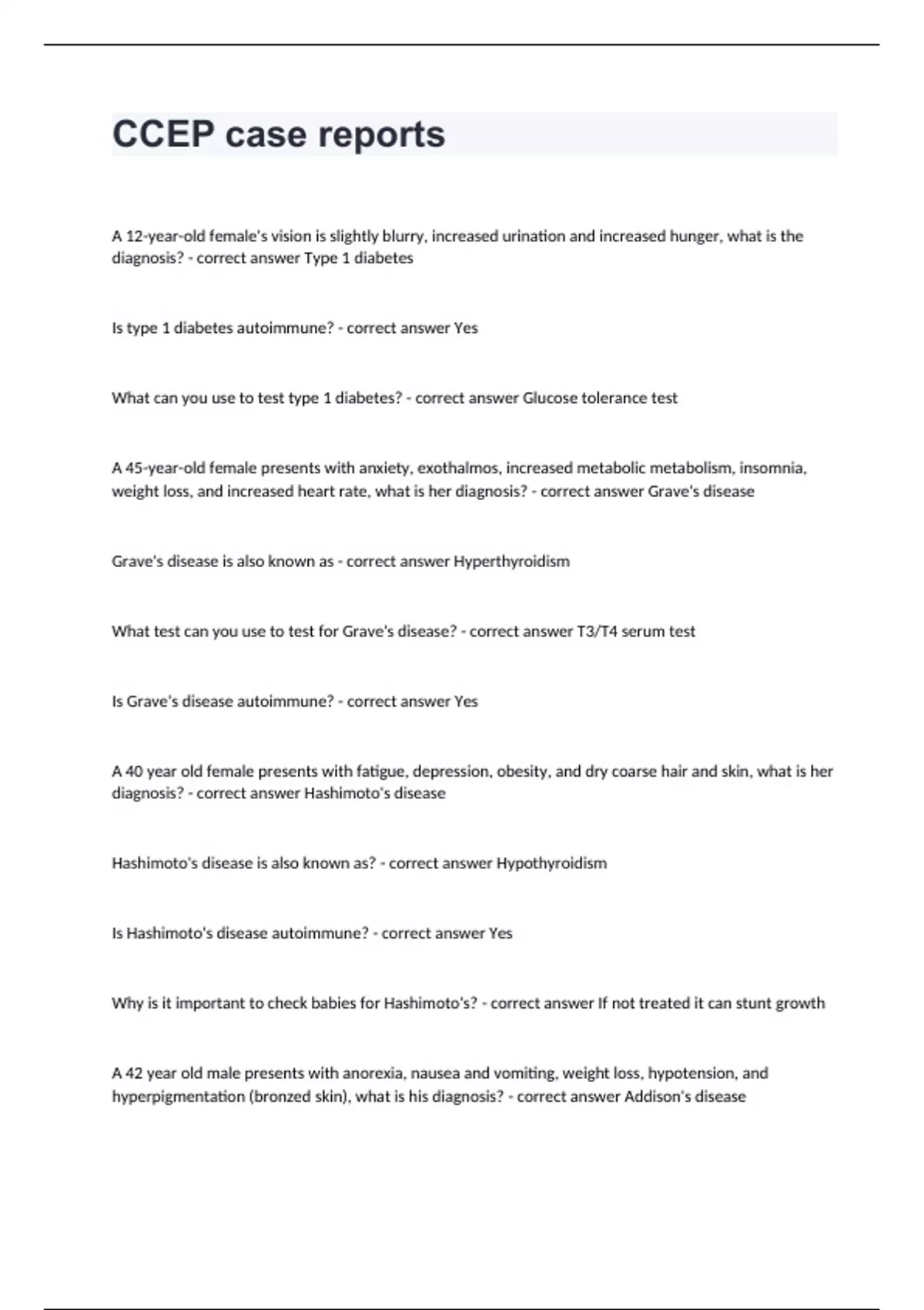 CCEP case reports A 12-year-old female's vision is slightly blurry, increased urination and increased hunger, what is the diagnosis? - correct answer Type 1 diabetes Is type 1 diabetes autoimmune? - correct answer Yes What can you use to test type 1 diabetes? - correct answer Glucose tolerance test A 45-year-old female presents with anxiety, exothalmos, increased metabolic metabolism, insomnia, weight loss, and increased heart rate, what is her diagnosis? - correct answer Grave's disease Grave's disease is also known as - correct answer Hyperthyroidism What test can you use to test for Grave's disease? - correct answer T3/T4 serum test Is Grave's disease autoimmune? - correct answer Yes A 40 year old female presents with fatigue, depression, obesity, and dry coarse hair and skin, what is her diagnosis? - correct answer Hashimoto's disease Hashimoto's disease is also known as? - correct answer Hypothyroidism Is Hashimoto's disease autoimmune? - correct answer Yes Why is it important to check babies for Hashimoto's? - correct answer If not treated it can stunt growth A 42 year old male presents with anorexia, nausea and vomiting, weight loss, hypotension, and hyperpigmentation (bronzed skin), what is his diagnosis? - correct answer Addison's disease