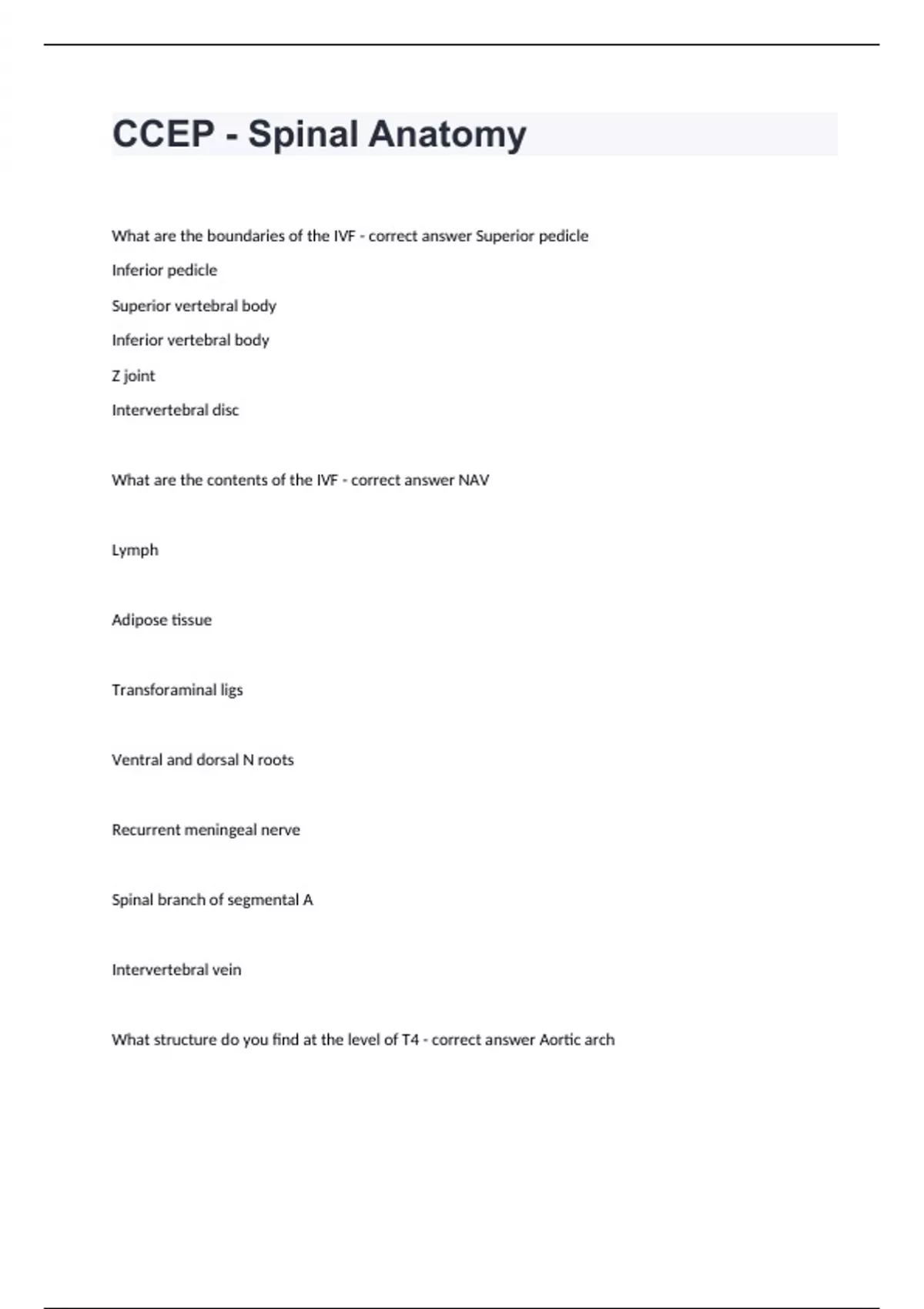 CCEP - Spinal AnatomyWhat are the boundaries of the IVF - correct answer Superior pedicle Inferior pedicle Superior vertebral body Inferior vertebral body Z joint Intervertebral disc What are the contents of the IVF - correct answer NAV Lymph Adipose tissue Transforaminal ligs Ventral and dorsal N roots Recurrent meningeal nerve Spinal branch of segmental A Intervertebral vein What structure do you find at the level of T4 - correct answer Aortic arch What structure do you find at the T4 disc level - correct answer Sternal angle of LOUIS What structure do you find at the level of T6 - correct answer Base of the heart What structure do you find at the level of T8 - correct answer Caval hiatus (diaphragm) What structure do you find at the level of T9 - correct answer Xiphisternal junction Fifth costal cartilage What structure do you find at the level of T10 - correct answer Apex of the heart What structure do you find at the level of the L5 disc - correct answer ASIS What organ do you find at the level of the coccyx - correct answer Bladder