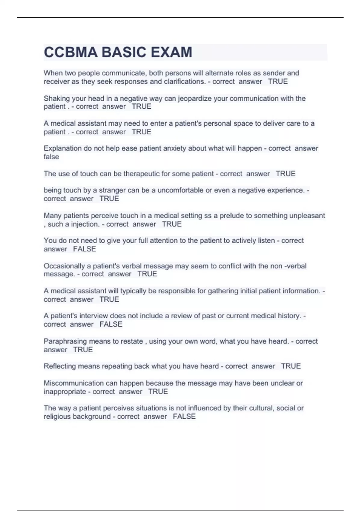 CCBMA BASIC EXAM QUESTIONS AND PASSED ANSWERS 2023/2024 When two people communicate, both persons will alternate roles as sender and receiver as they seek responses and clarifications. - correct answer TRUE Shaking your head in a negative way can jeopardize your communication with the patient . - correct answer TRUE A medical assistant may need to enter a patient's personal space to deliver care to a patient . - correct answer TRUE Explanation do not help ease patient anxiety about what will happen - correct answer false The use of touch can be therapeutic for some patient - correct answer TRUE being touch by a stranger can be a uncomfortable or even a negative experience. - correct answer TRUE Many patients perceive touch in a medical setting ss a prelude to something unpleasant , such a injection. - correct answer TRUE You do not need to give your full attention to the patient to actively listen - correct answer FALSE Occasionally a patient's verbal message may seem to conflict with the non -verbal message. - correct answer TRUE A medical assistant will typically be responsible for gathering initial patient information. - correct answer TRUE A patient's interview does not include a review of past or current medical history. - correct answer FALSE Paraphrasing means to restate , using your own word, what you have heard. - correct answer TRUE Reflecting means repeating back what you have heard - correct answer TRUE Miscommunication can happen because the message may have been unclear or inappropriate - correct answer TRUE The way a patient perceives situations is not influenced by their cultural, social or religious background - correct answer FALSE A physician may instruct a medical assistant to give medication by injection - correct answer true medical assistant are permitted to start intravenous therapy . - correct answer false medical assistant may assist with minor surgery - correct answer true if a physician is present on the site , a medical assistant may apply bandages. - correct answer true a medical assistant may administer a narcotic injection - correct answer true california law allows a medical assistant to draw blood in the clinical setting if they have completed proper training - correct answer true if directed , medical assistant may insert urinary catheter - correct answer false medical assistant are allowed to interpret laboratory result - correct answer false ear lavage may be performed by a medical assistant if the physician is on site - correct answer true