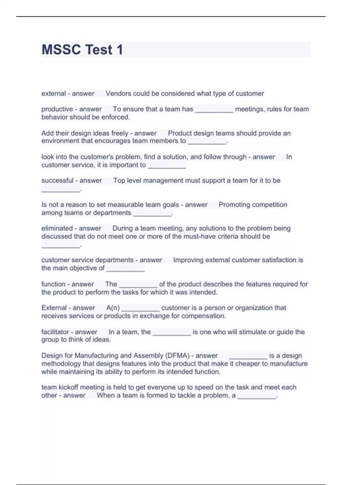 MSSC Test 1 Questions with correct Answers 2024