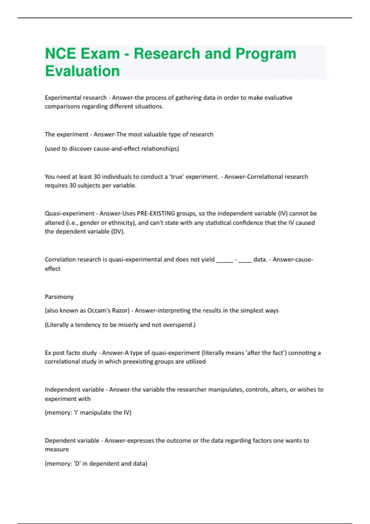 Experimental research - Answer-the process of gathering data in order to make evaluative comparisons regarding different situations. The experiment - Answer-The most valuable type of research (used to discover cause-and-effect relationships) You need at least 30 individuals to conduct a 'true' experiment. - Answer-Correlational research requires 30 subjects per variable. Quasi-experiment - Answer-Uses PRE-EXISTING groups, so the independent variable (IV) cannot be altered (i.e., gender or ethnicity), and can't state with any statistical confidence that the IV caused the dependent variable (DV). Correlation research is quasi-experimental and does not yield _____ - ____ data. - Answer-causeeffect Parsimony (also known as Occam's Razor) - Answer-interpreting the results in the simplest ways (Literally a tendency to be miserly and not overspend.) Ex post facto study - Answer-A type of quasi-experiment (literally means 'after the fact') connoting a correlational study in which preexisting groups are utilized Independent variable - Answer-the variable the researcher manipulates, controls, alters, or wishes to experiment with (memory: 'I' manipulate the IV) Dependent variable - Answer-expresses the outcome or the data regarding factors one wants to measure (memory: 'D' in dependent and data)Internal validity - Answer-Refers to whether the DVs were truly influenced by the experimental IVs or whether other factors had an impact. Threats to internal validity - Answer-maturation of subjects (psychological and physical changes including fatigue due to time involved), mortality (subjects withdrawing), instruments used to measure the behavior or trait, or statistical regression (notion that extremely high or low scores would move toward the mean if utilized again) External validity - Answer-Refers to whether the experimental research results can be generalized to larger populations (other people, settings, conditions). [If the results of the study only apply to the population in the study then external validity is LOW.] Causal Comparative design - Answer-a true experiment WITHOUT random assignment (Data from the causal comparative ex post factor [after the fact] design can be analyzed with a test of significance [t test or ANOVA] just like any true experiment.) Factor analysis - Answer-Statistical procedure to summarize MANY variables. (i.e., A test measuring a counselors ability may try to describe 3 important variables that make up an effective helper although hundreds exist.)