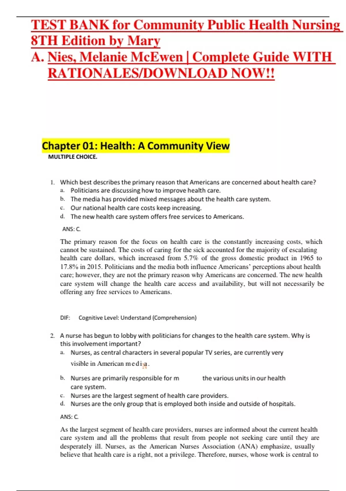 Test Bank For Community/Public Health Nursing: Promoting the Health of Populations 8th Edition by Mary A. Nies, Melanie McEwen