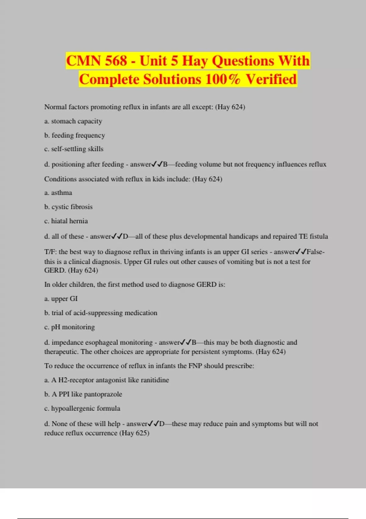 CMN 568 - Unit 5 Hay Questions With Complete Solutions 100% Verified Normal factors promoting reflux in infants are all except: (Hay 624) a. stomach capacity b. feeding frequency c. self-settling skills d. positioning after feeding - answerB—feeding volume but not frequency influences reflux Conditions associated with reflux in kids include: (Hay 624) a. asthma b. cystic fibrosis c. hiatal hernia d. all of these - answerD—all of these plus developmental handicaps and repaired TE fistula T/F: the best way to diagnose reflux in thriving infants is an upper GI series - answerFalse- this is a clinical diagnosis. Upper GI rules out other causes of vomiting but is not a test for GERD. (Hay 624) In older children, the first method used to diagnose GERD is: a. upper GI b. trial of acid-suppressing medication c. pH monitoring d. impedance esophageal monitoring - answerB—this may be both diagnostic and therapeutic. The other choices are appropriate for persistent symptoms. (Hay 624) To reduce the occurrence of reflux in infants the FNP should prescribe: a. A H2-receptor antagonist like ranitidine b. A PPI like pantoprazole c. hypoallergenic formula d. None of these will help - answerD—these may reduce pain and symptoms but will not reduce reflux occurrence (Hay 625) If the parents of an infant with reflux has been trying special formula and/or acid-suppression agents and are not experiencing improvement, at what point would they STOP? a. 2 weeks b. 1 month c. 6 weeks d. 2 months - answerA—2 weeks (Hay 625) The FNP should instruct which parents that spontaneous resolution of their child's reflux is unlikely to occur: a. 8 month old with a large hiatal hernia b. 24 month old on ranitidine c. 9 month old on omeprazole d. both a & b - answerD—large hiatal hernia is an indication for fundoplication surgery to correct the condition, reflux resolves in 85% of kids by age 12 months and is less likely to resolve in older children (Hay 625) An 8 year old boy presents with his mother, they are concerned b/c he has a history of GERD unresponsive to medication, he takes forever to eat dinner and has trouble swallowing food that is textured. The FNP should consider: a. fundoplication for his GERD b. Eosinophillic esophagitis c. ADHD d. achalasia of the esophagus - answerB—EoE presents with abd pain, vomiting, lengthy chewing, long meal times, washing food down with liquid, avoiding highly textured foods, and symptoms unresponsive to GERD treatments (Hay 626) Which of the following when found in addition to esophageal dysfunction is not diagnostic for EoE? a. white spots of eosinophils in esophagus b. hypertrophied esophageal mucosa c. elevated serum IgE levels d. longitudinal mucosal fissures - answerC—Serum IgE is often elevated but not diagnostic (Hay 626) To treat EoE the patient sho