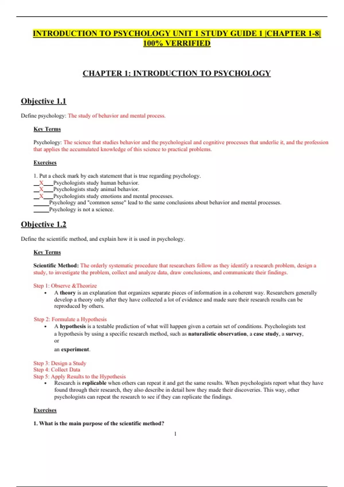 INTRODUCTION TO PSYCHOLOGY UNIT 1 STUDY GUIDE 1 |CHAPTER 1-8| 100% VERRIFIED CHAPTER 1: INTRODUCTION TO PSYCHOLOGY Objective 1.1 Define psychology: The study of behavior and mental process. Key Terms Psychology: The science that studies behavior and the psychological and cognitive processes that underlie it, and the profession that applies the accumulated knowledge of this science to practical problems. Exercises 1. Put a check mark by each statement that is true regarding psychology. X Psychologists study human behavior. X Psychologists study animal behavior. X Psychologists study emotions and mental processes. Psychology and "common sense" lead to the same conclusions about behavior and mental processes. Psychology is not a science. Objective 1.2 Define the scientific method, and explain how it is used in psychology. Key Terms Scientific Method: The orderly systematic procedure that researchers follow as they identify a research problem, design a study, to investigate the problem, collect and analyze data, draw conclusions, and communicate their findings. Step 1: Observe &Theorize • A theory is an explanation that organizes separate pieces of information in a coherent way. Researchers generally develop a theory only after they have collected a lot of evidence and made sure their research results can be reproduced by others. Step 2: Formulate a Hypothesis • A hypothesis is a testable prediction of what will happen given a certain set of conditions. Psychologists test a hypothesis by using a specific research method, such as naturalistic observation, a case study, a survey, or an experiment. Step 3: Design a Study Step 4: Collect Data Step 5: Apply Results to the Hypothesis • Research is replicable when others can repeat it and get the same results. When psychologists report what they have found through their research, they also describe in detail how they made their discoveries. This way, other psychologists can repeat the research to see if they can replicate the findings. Exercises 1. What is the main purpose of the scientific method? The scientific method is a standardized way of making observations, gathering data, forming theories, testing predictions, and interpreting results. Researchers make observations to describe and measure behavior. 2. The steps of the scientific method are (1) identify a problem or research question, (2) design a study, (3) collect data, (4) analyze data, (5) draw conclusions, and (6) communicate findings. Identify the step associated with each of the following activities: 3 Dr. Lopez noted "absent" or "present" by each student's name on his class roll at each class meeting. He recorded students' exam scores on his roll sheet as well. 5 Dr. Lopez hypothesized that students who consistently attend class get higher grades than those who are absent more often. 6 Dr. Lopez published the results of his study in the Journal of Community College Teaching. 4_ Dr. Lopez calculated the correlation between his students' rates of absence and their exam scores and found that the two variables were positively associated. 1_ Dr. Lopez planned to track students' attendance and exam scores and to correlate these two variables at the end of the semester. 2_ Dr. Lopez inferred that the data he collected supported his hypothesis regarding the relationship between attendance and exam scores. Objective 1.3 Describe the major schools of thought and theoretical perspectives in psychology. Key Terms Behaviorism: The school of psychology that views observerable, measurable behavior as the appropriate subject matter for psychology and emphasizes the key role of environment as a determinant of behavior. • The view that psychology (1) should be an objective science that (2) studies behavior without reference to mental processes. Most research psychologists today agree with (1) but not (2). Psychoanalysis: Freud's theory of personality that attributes our thoughts and actions to unconscious motives and conflicts, the techniques used in treating psychological disorders by seeking to expose and interpret unconscious tensions. Humanistic psychology: A theoretical orientation that emphasizes the unique qualities of humans, especially their person (psychological health.) and their potential for personal growth. • Positive Psychology - The scientific study of psychological characteristics that enable individuals and communities to thrive in the face of adversity. Cognitive Psychology: The branch of psychology that sees humans as active participants in their environment and is concerned with the scientific study of the mental processes involved in perception, attention, memory, language, problem solving, reasoning, and decision making. In short, cognitive psychology is concerned with the scientific study of the mind and mental processes. • Gestalt Psychology - The school of psychology that emphasizes that individuals perceive objects and patterns as whole units and that the perceived whole is more than the sum of its parts. • Information-Processing Theory - An approach to the study of mental structures and processes that uses the computer as a model for human thinking. Evolutionary psychology: The school of psychology that studies how human behaviors required for survival have adapted in the face of environmental pressures over the long course of evolution. Biological psychology: The school of psychology that looks for links between specific behaviors and equally specific biological processes that often help explain individual differences. • Neuroscience - An interdisciplinary field that combines the work of psychologists, biologists, biochemists, medical researchers, and others in the study of the structure and function of the nervous system. Sociocultural Approach: The view that social and cultural factors may be just as powerful as evolutionary and physiological factors in affecting behavior and mental processing and that these factors must be understood when interpreting t