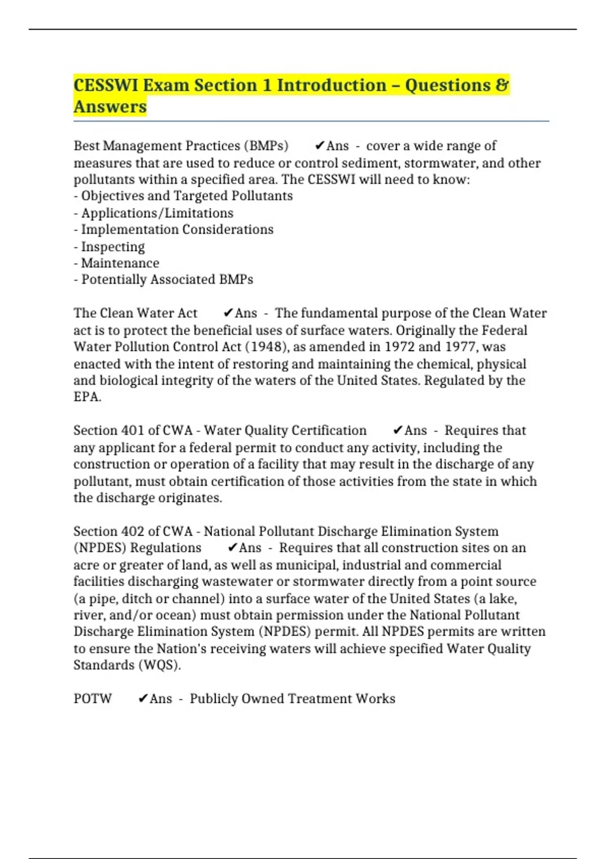 POTW ✔️Ans - Publicly Owned Treatment Works