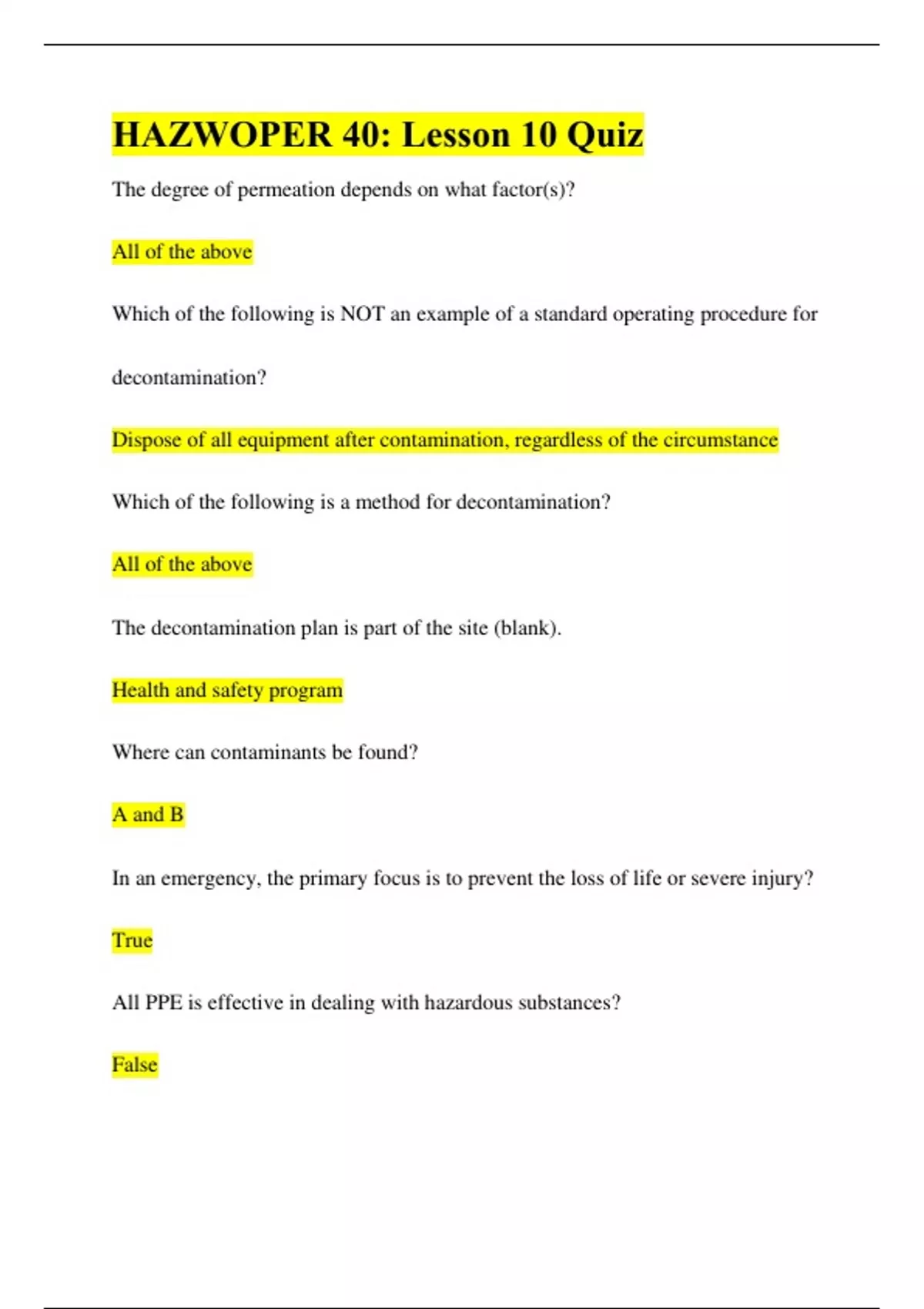 HAZWOPER 40: Lesson 10 Quiz The degree of permeation depends on what factor(s)? All of the above Which of the following is NOT an example of a standard operating procedure for decontamination? Dispose of all equipment after contamination, regardless of the circumstance Which of the following is a method for decontamination?