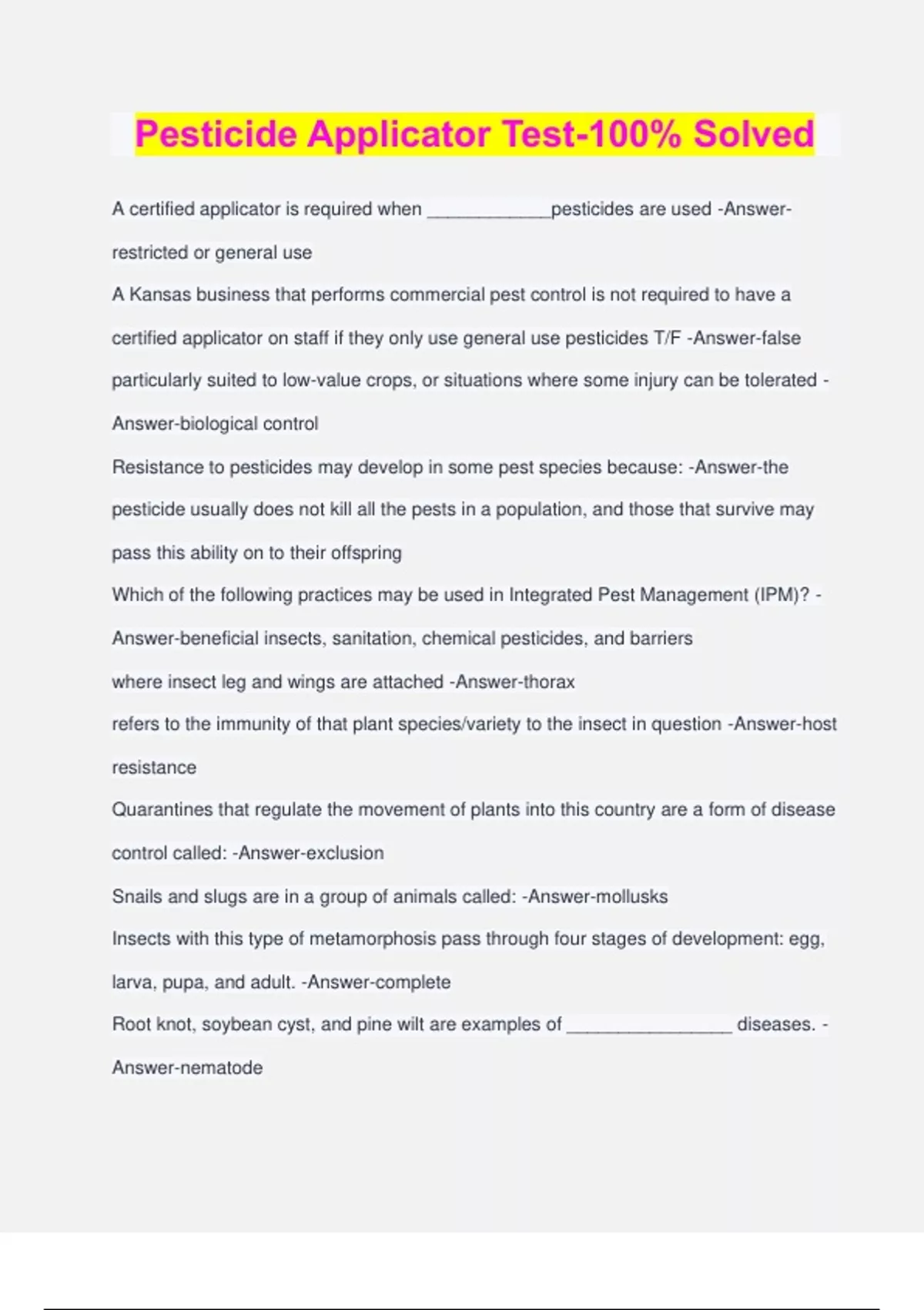 Pesticide Applicator Test-100% Solved A certified applicator is required when ____________pesticides are used -Answer- restricted or general use A Kansas business that performs commercial pest control is not required to have a certified applicator on staff if they only use general use pesticides T/F -Answer-false particularly suited to low-value crops, or situations where some injury can be tolerated - Answer-biological control Resistance to pesticides may develop in some pest species because: -Answer-the pesticide usually does not kill all the pests in a population, and those that survive may pass this ability on to their offspring Which of the following practices may be used in Integrated Pest Management (IPM)? - Answer-beneficial insects, sanitation, chemical pesticides, and barriers where insect leg and wings are attached -Answer-thorax refers to the immunity of that plant species/variety to the insect in question -Answer-host resistance Quarantines that regulate the movement of plants into this country are a form of disease control called: -Answer-exclusion Snails and slugs are in a group of animals called: -Answer-mollusks Insects with this type of metamorphosis pass through four stages of development: egg, larva, pupa, and adult. -Answer-complete Root knot, soybean cyst, and pine wilt are examples of ________________ diseases. - Answer-nematode Mycoplasmas are a type of_____________that lacks a cell wall. -Answer-bacteria Which type of weed germinates in the fall, then dies the following summer after flowering and setting seed? -Answer-winter annual The most common formulation of vertebrate poisons is.. -Answer-baits Which is a label statement associated with a DANGER signal word? -Answer-corrosive- causes eye damage and severe skin burns Which is a label statement associated with a CAUTION signal word? -Answer-may be harmful if absorbed through skin Which is a label statement associated with a WARNING signal word? -Answer-harmful or fatal if swallowed what is not likely to be found on a pesticide label -Answer-pests that the pesticide will not control Labels do not normally give instructions on how to store pesticides. T/F -Answer-False Which identifies the facility that produced a pesticide? -Answer-establishment number Which formulation is most likely to leave a visible residue on plant foliage? -Answer- wettable powder fumigant -Answer-forms a gas when applied, usually toxic to people dust -Answer-low percentage of a.i., applied in dry form, talc-like consistency emulsifiable concentrate -Answer-liquid formulation where the insoluble a.i. forms an emulsion in water (more likely to cause phytotoxicity to desirable plants)