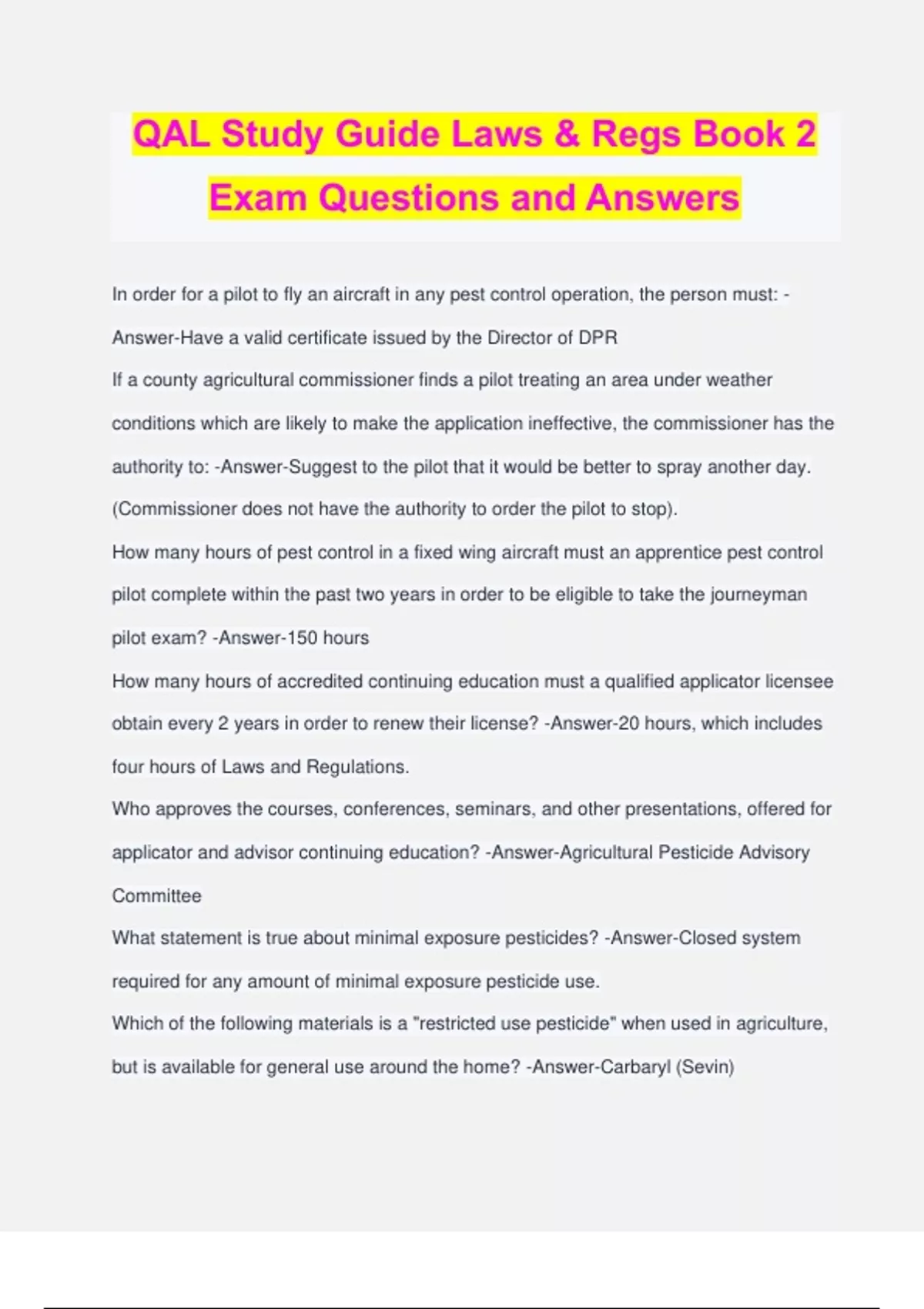 QAL Study Guide Laws & Regs Book 2 Exam Questions and Answers In order for a pilot to fly an aircraft in any pest control operation, the person must: - Answer-Have a valid certificate issued by the Director of DPR If a county agricultural commissioner finds a pilot treating an area under weather conditions which are likely to make the application ineffective, the commissioner has the authority to: -Answer-Suggest to the pilot that it would be better to spray another day. (Commissioner does not have the authority to order the pilot to stop). How many hours of pest control in a fixed wing aircraft must an apprentice pest control pilot complete within the past two years in order to be eligible to take the journeyman pilot exam? -Answer-150 hours How many hours of accredited continuing education must a qualified applicator licensee obtain every 2 years in order to renew their license? -Answer-20 hours, which includes four hours of Laws and Regulations. Who approves the courses, conferences, seminars, and other presentations, offered for applicator and advisor continuing education? -Answer-Agricultural Pesticide Advisory Committee What statement is true about minimal exposure pesticides? -Answer-Closed system required for any amount of minimal exposure pesticide use. Which of the following materials is a "restricted use pesticide" when used in agriculture, but is available for general use around the home? -Answer-Carbaryl (Sevin) Which of the following is a restricted use herbicide? -Answer-2, 4-D If the tolerance for organophosphate pesticide "A" on celery is 1.0 ppm, and the tolerance for organophosphate "B" on celery is 2.0 ppm, how much of pesticide "B" would be permitted on celery that has a residue of 0.5ppm of pesticide "A"? -Answer-1.0 ppm When a food commodity has residues from two pesticides belonging to different chemical families, the maximum allowable pesticide residue is the: -Answer-Maximum allowable residue for each pesticide on that commodity. A restricted use pesticide is one that is for sale to and used by: -Answer-Certified applicators or persons under their direct supervision. Who is responsible for taking pesticide samples and analyzing them for adulteration and misbranding? -Answer-The Director of Dept. of Pesticide Regulation For each branch sales yard, store, or sales location which is owned and operated by a dealer, an additional license fee of ___ is required each year. -Answer-$50.00 When must an agricultural pest control advisor supply a copy of a recommendation to the county agricultural commissioner? -Answer-Upon Request A pest control dealer can sell or deliver a California restricted material to a customer when the: -Answer-Dealer obtains a copy of the customer's restricted materials permit. When an emergency or accident results in a pesticide
