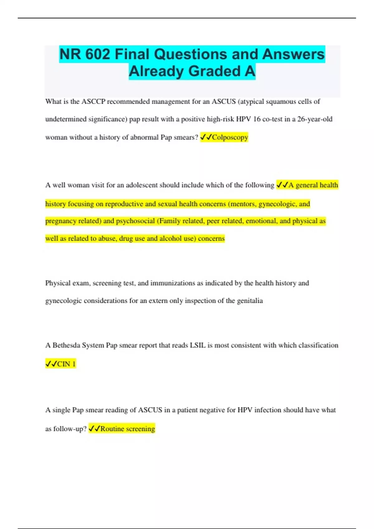 Already Graded A What is the ASCCP recommended management for an ASCUS (atypical squamous cells of undetermined significance) pap result with a positive high-risk HPV 16 co-test in a 26-year-old woman without a history of abnormal Pap smears? Colposcopy A well woman visit for an adolescent should include which of the following A general health history focusing on reproductive and sexual health concerns (mentors, gynecologic, and pregnancy related) and psychosocial (Family related, peer related, emotional, and physical as well as related to abuse, drug use and alcohol use) concerns Physical exam, screening test, and immunizations as indicated by the health history and gynecologic considerations for an extern only inspection of the genitalia A Bethesda System Pap smear report that reads LSIL is most consistent with which classification CIN 1 A single Pap smear reading of ASCUS in a patient negative for HPV infection should have what as follow-up? Routine screening A female patient is 35 years old. She has never had an abnormal Pap smear and has had regular screening since age 18. If she has a normal Pap smear with HPV testing today, when should she have the next cervical cancer screening Five years A young sexually active client of the family planning clinic is advised to have a Pap smear. She has never had a Pap smear before. What should the nurse include in the explanation of this procedure The Pap smear can detect cancer of the cervix Lab results on your 26-year-old patient show a negative Pap smear with a positive HPV screen. Which procedure will be required next Repeat Pap and HPV screen Which of the following is not part of the criteria for an older woman to see if having any future Pap test performed Over 55 years of age You are evaluating a 17-year-old Emily who presented with amenorrhea and normal secondary sex characteristics. The purpose of the progesterone challenge is to a certain the presence of Endogenous estrogen A 17-year-old female patient presents with amenorrhea for four months she did experience menarche at age 15 but had not had a menstrual cycle since. On physical examination, it is noted that she has normal secondary sexual characteristics. The nurse practitioner will consider progesterone challenge to determine the presence of adequate Endogenous estrogen A teenage patient presents with amenorrhea and moral secondary sex characteristics. The progesterone challenge is ordered. the purpose is to determine the presence of Endogenous estrogen 18-year-old female complaining of secondary amenorrhea. On exam, there is a normal secondary sex characteristics and normal genitalia. Pregnancy is ruled out what would necessitate further evaluation Galactorrhea Primary amenorrhea is best described as Failure to menstrate by 13 years old A nurse practitioner is participating in a woman's health fair. When educating the woman about risk factors for breast cancer which of the following statements is incorrect? Fibrocystic breast disease When educating women about breast cancer risk factors which statement is incorrect Fibrocystic breast disease A woman with lobular carcinoma in situ has a relative risk of developing invasive breast cancer of 8.0 Changes and hormonal regulation during menopause result in the gradual cessation of menstruation. From which gland is Androstenedione secreted Adrenals A Pap smear results of atypical squamous cells of undetermined significance rule out high-grade squamous intraepithelial lesion will require which procedure Colposcopy A Pap smear results of atypical squamous cells of undetermined significance require which procedure next Follow-up Pap smear A 25-year-old presents with a report of a very tender area just near her introitus and to the left of her perineum. Very painful sex is how she knew something wasn't right. She showered and when washing, she felt a P sized painful lump on the left side of her bottom. She tells you she looked at it with the mirror and it was very small but now it is the size of a ping-pong ball and getting worse. when you Inspect her genitalia you are amazed at the size and appearance of the lump you know what appears to be an abscess on the left medial side of the labia minora and there is some edema extending into the perineum. Your diagnosis for