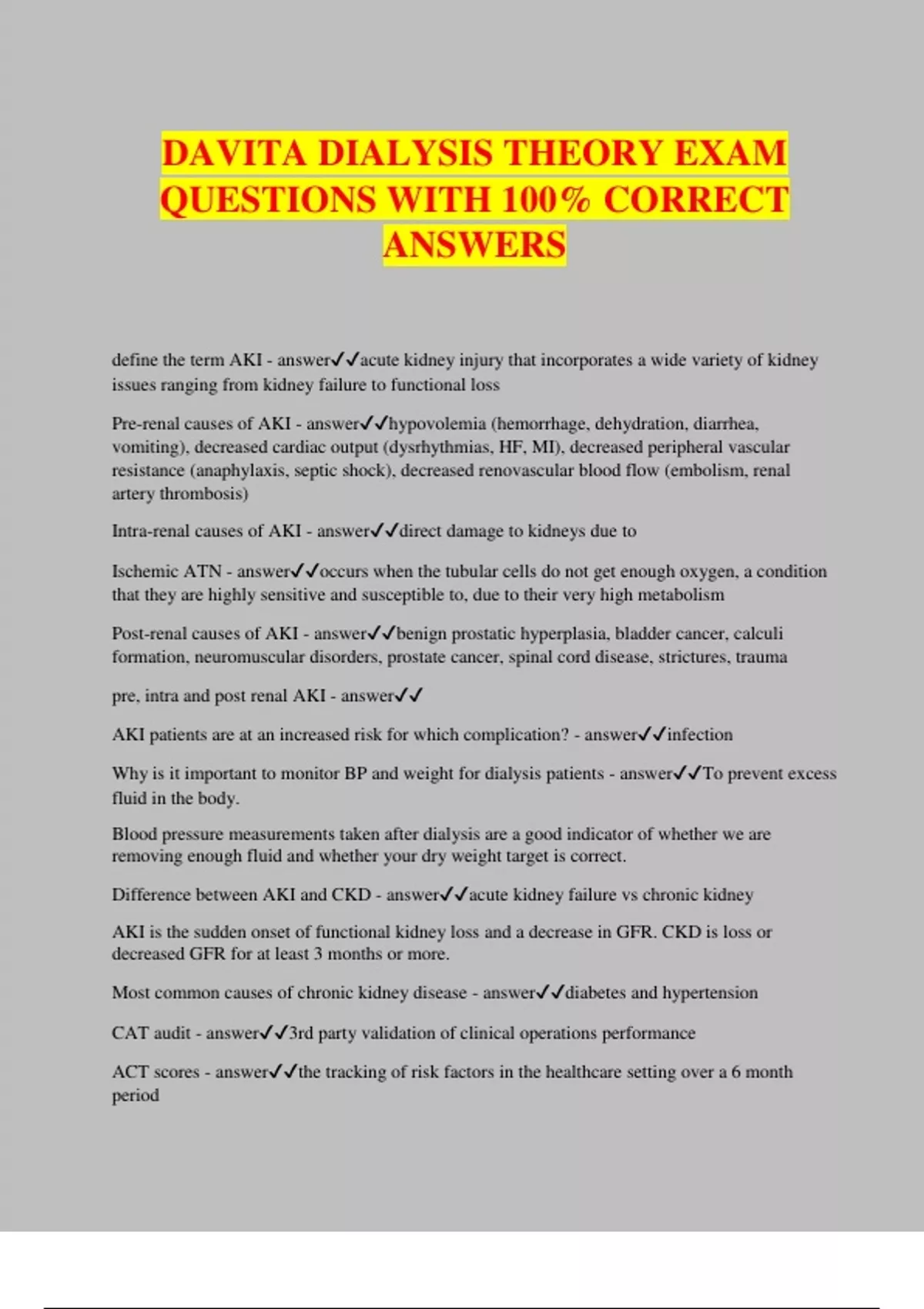 DAVITA DIALYSIS THEORY EXAM QUESTIONS WITH 100% CORRECT ANSWERS define the term AKI - answeracute kidney injury that incorporates a wide variety of kidney issues ranging from kidney failure to functional loss Pre-renal causes of AKI - answerhypovolemia (hemorrhage, dehydration, diarrhea, vomiting), decreased cardiac output (dysrhythmias, HF, MI), decreased peripheral vascular resistance (anaphylaxis, septic shock), decreased renovascular blood flow (embolism, renal artery thrombosis) Intra-renal causes of AKI - answerdirect damage to kidneys due to Ischemic ATN - answeroccurs when the tubular cells do not get enough oxygen, a condition that they are highly sensitive and susceptible to, due to their very high metabolism Post-renal causes of AKI - answerbenign prostatic hyperplasia, bladder cancer, calculi formation, neuromuscular disorders, prostate cancer, spinal cord disease, strictures, trauma pre, intra and post renal AKI - answer AKI patients are at an increased risk for which complication? - answerinfection Why is it important to monitor BP and weight for dialysis patients - answerTo prevent excess fluid in the body. Blood pressure measurements taken after dialysis are a good indicator of whether we are removing enough fluid and whether your dry weight target is correct. Difference between AKI and CKD - answeracute kidney failure vs chronic kidney AKI is the sudden onset of functional kidney loss and a decrease in GFR. CKD is loss or decreased GFR for at least 3 months or more. Most common causes of chronic kidney disease - answerdiabetes and hypertension CAT audit - answer3rd party validation of clinical operations performance ACT scores - answerthe tracking of risk factors in the healthcare setting over a 6 month period MeerCAT audit - answerself reported review of clinical operations performance What is the difference between data collection and assessment--and who does what - answerNurse performs any assessments and data collection while the technicians are allowed to only data collect-- Data collection: numerical values from monitors Assessment: making a judgement based on findings Why do we document in the medical record - answerproof of care data continuity permanent legal record communication BP reading if cuff is too small - answerFalse high reading BP reading if cuff is too big - answerfalsely low reading BP reading if clothing is too thick - answerfalsely high reading BP reading if patient has peripheral vascular disease - answerhigh BP BP reading if patient has bradycardia - answerhigh arterial BP BP reading if patient has arrhythmias - answerLow BP what does SMART communication stand for - answerSimple Meaningful Actual Read Teach What are the five "W's" when completing an REM - answerwho what when where why what are the three things you should not include in an REM - answeropinions, vendettas, speculation When dialyzing a patient with AKI, monitoring weight and BP is important because - answerhypovolemia and hypotensive episodes can cause renal ischemia and further damage What are the four consequences of sodium loading a patient - answeredema, thirst, weight gain and hyperten