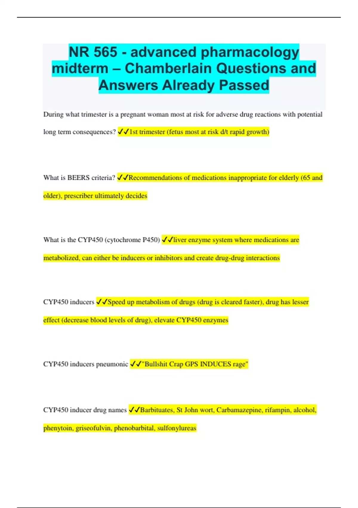 NR 565 - advanced pharmacology midterm – Chamberlain Questions and Answers Already Passed During what trimester is a pregnant woman most at risk for adverse drug reactions with potential long term consequences? 1st trimester (fetus most at risk d/t rapid growth) What is BEERS criteria? Recommendations of medications inappropriate for elderly (65 and older), prescriber ultimately decides What is the CYP450 (cytochrome P450) liver enzyme system where medications are metabolized, can either be inducers or inhibitors and create drug-drug interactions CYP450 inducers Speed up metabolism of drugs (drug is cleared faster), drug has lesser effect (decrease blood levels of drug), elevate CYP450 enzymes CYP450 inducers pneumonic "Bullshit Crap GPS INDUCES rage" CYP450 inducer drug names Barbituates, St John wort, Carbamazepine, rifampin, alcohol, phenytoin, griseofulvin, phenobarbital, sulfonylureas CYP450 inhibitors inhibit metabolism, increase blood levels of medications CYP450 pneumonic "VISA credit card debt INHIBITS spending on designers like CK to look GQ" CYP450 inhibitors drug names Valproate, isoniazid, sulfonamides, amiodarone, chloramphenicol, ketoconazole, grapefruit juice, quinidine Physiological changes during pregnancy that impact pharmacodynamics and pharmacokinetic properties of drugs? increase glomerular filtration rate leads to increase durg excretion increase hepatic metabolism decrease tone and motility of bowel increase drug absorption Examples of medications that can be teratogenic Antiepileptic drugs, antimicrobials such as tetracyclines and fluoroquinolones, vitamin A in large doses, some anticoagulants, and hormonal medications such as diethylstilbestrol (DES). How is absorption of intramuscular medications different in neonates? slow and erratic due to low blood flow in muscles first few days of life Why is absorption of medication in the stomach increased in infancy? delayed gastric emptying Some medications that should be avoided in the pediatric patient? glucocorticoids, discoloration of developing teeth with tetracyclines, and kernicterus with sulfonamides, levofloxacin (antibiotics) aspirin (Severe intoxication from acute overdose) what should be included in medication administration patient education? dosage size and timing route and technique of administration duration of treatment drug storage nature and time course of desired responses nature and time course of adverse responses finish taking antibiotic What are some things that put the elderly patient at higher risk for adverse drug reactions? reduced renal function polypharmacy (the use of five or more medications daily) greater severity of illness presence of comorbidities use of drugs that have a low therapeutic index (e.g., digoxin) increased individual variation secondary to altered pharmacokinetics inadequate supervision of long-term therapy poor patient adherence How can healthcare providers decrease likelihood of an elderly patient experiencing an adverse drug reaction? obtaining a thorough drug history that includes over-the-counter medications considering pharmacokinetic and pharmacodynamics changes due to age monitoring the patient's clinical response and plasma drug levels using the simplest regimen possible monitoring for drug-drug interactions and iatrogenic illness periodically reviewing the need for continued drug therapy encouraging the patient to dispose of old medications taking steps to promote adherence and to avoid drugs on the Beers list How can we promote medication adherence with elderly patients? simplifying drug regimens providing clear and concise verbal and written instructions using an appropriate dosage form clearly labeling and dispensing easy-to-open containers developing daily reminders monitoring frequently affordability of drugs support systems Why do nitrates need to be taken no later than 4 PM? Need nitrate free interval so tolerance doesn't develop Nine factors that impact outcome of medication? Gender and race Genetics and pharmacogenomics Variability in absorption placebo effect Tolerance patho age bodyweight Do you need informed consent for genetic testing? yes What is the purpose of the Genetic Information Non-Discriminatory Act? Protects patients from discrimination by employers and insurance providers based on genetic information Difference between practice authority and prescriptive authority? Practice authority refers to the nurse practitioner's ability to practice without physician oversight, whereas prescriptive authority refers to the nurse practitioner's authority to prescribe medications independently and without limitations. Who regulates prescriptive authority? the jurisdiction of a health professional board. This may be the State Board of Nursing, the State Board of Medicine, or the State Board of Pharmacy, as determined by each state. What is scope of practice determined by? is determined by state practice and licensure laws. What is full practice authority? Nurse practitioners have the autonomy to evaluate patients, diagnose, order and interpret tests, initiate and manage treatments and prescribe medications, including controlled substances without physician oversight. What is reduced practice authority? Nurse practitioners are limited in at least one element of practice. The state requires a formal collaborative agreement with an outside health discipline for the nurse practitioner to provide patient care. ex/ physician involvement for 5 yrs than independent What is restricted practice authority? Nurse practitioners are limited in at least one element of practice by requiring supervision, delegation, or team management by an outside health discipline for the nurse practitioner to provide patient care.- typically doctor on site What are components of Rx? Prescriber Contact info Prescribers name NPI DEA Patient name DOB Date Allergies Medication name Strength Quantity Indication for use Direction for use Refills Signature What are some potential problems