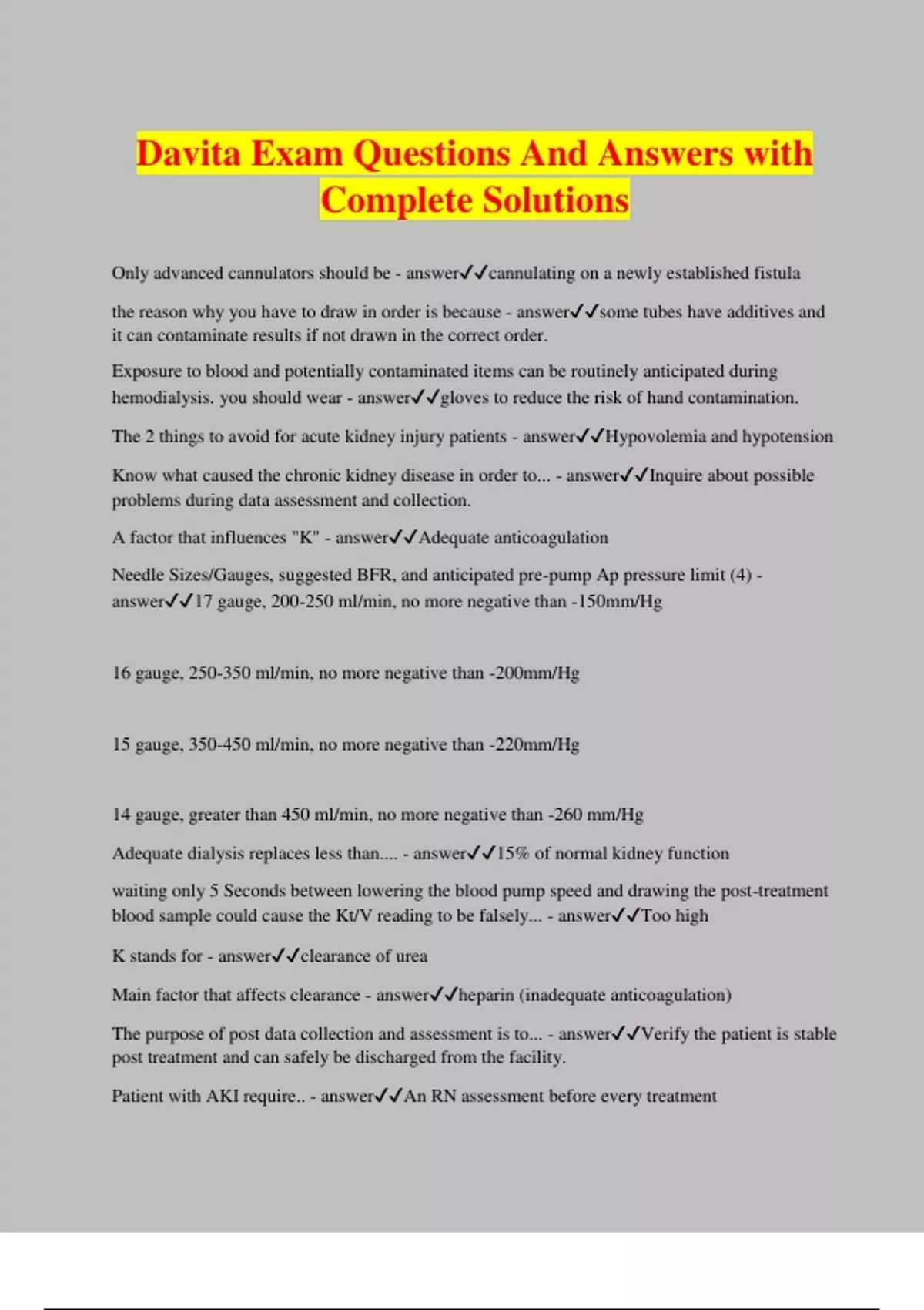 Davita Exam Questions And Answers with Complete Solutions Only advanced cannulators should be - answercannulating on a newly established fistula the reason why you have to draw in order is because - answersome tubes have additives and it can contaminate results if not drawn in the correct order. Exposure to blood and potentially contaminated items can be routinely anticipated during hemodialysis. you should wear - answergloves to reduce the risk of hand contamination. The 2 things to avoid for acute kidney injury patients - answerHypovolemia and hypotension Know what caused the chronic kidney disease in order to... - answerInquire about possible problems during data assessment and collection. A factor that influences "K" - answerAdequate anticoagulation Needle Sizes/Gauges, suggested BFR, and anticipated pre-pump Ap pressure limit (4) - answer17 gauge, 200-250 ml/min, no more negative than -150mm/Hg 16 gauge, 250-350 ml/min, no more negative than -200mm/Hg 15 gauge, 350-450 ml/min, no more negative than -220mm/Hg 14 gauge, greater than 450 ml/min, no more negative than -260 mm/Hg Adequate dialysis replaces less than.... - answer15% of normal kidney function waiting only 5 Seconds between lowering the blood pump speed and drawing the post-treatment blood sample could cause the Kt/V reading to be falsely... - answerToo high K stands for - answerclearance of urea Main factor that affects clearance - answerheparin (inadequate anticoagulation) The purpose of post data collection and assessment is to... - answerVerify the patient is stable post treatment and can safely be discharged from the facility. Patient with AKI require.. - answerAn RN assessment before every treatment If the patient has any abnormal findings you must - answerReport it to the RN If no abnormal findings - answerthe PCT may start treatment and the RN can asses within the 1st hour. Squeezing the cuff to speed up deflation may - answerDamage the internal working of the blood pressure monitor. Post dialysis data collection and assessment helps - answerVerify that the patient is stable and safe for discharge Evaluate the effectiveness of the treatment plan Notify the nurse if there are any unusual or abnormal finding before discharging the patient RN post assessment before discharge Document provides - answerpermanent legal record to protect the patient, team, and DaVita. Can post treatment data collection be done five minutes before the patient comes off the machine? - answerno, it has to be done after blood is returned/treatment is complete. How do you draw a post lab? - answerlower the blood pump to 100 and then wait 15 seconds before drawing the blood sample. What do you document for a decrease In blood pressure - answerdocument blood pressure and amount of saline given, and document blood pressure after saline bolus is given T.R.A.M.P stands for - answertime, route, amount, medication, patient Can a PCT document "edema" - answerno, they can report swelling Failure to use SMART communications - answerexposes you and DVA to lia