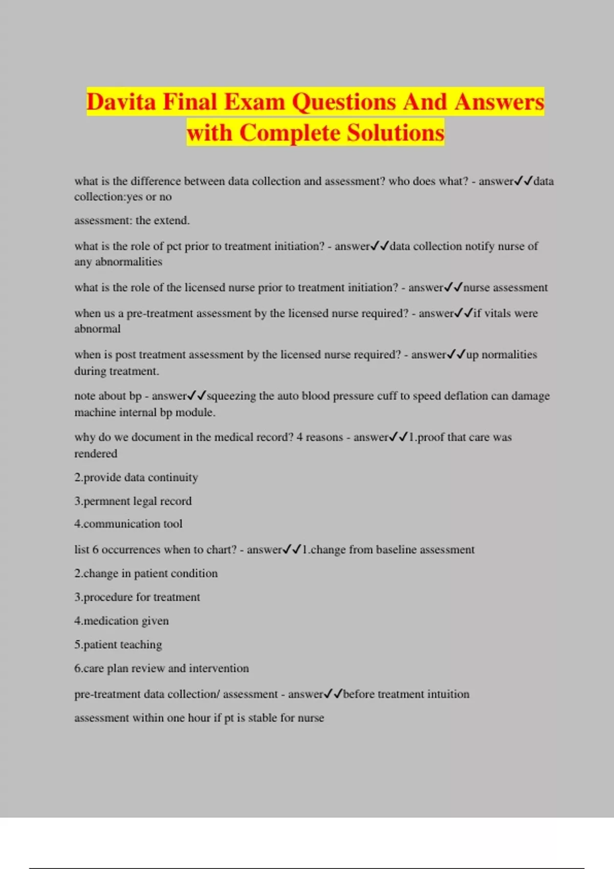 Davita Final Exam Questions And Answers with Complete Solutions what is the difference between data collection and assessment? who does what? - answerdata collection:yes or no assessment: the extend. what is the role of pct prior to treatment initiation? - answerdata collection notify nurse of any abnormalities what is the role of the licensed nurse prior to treatment initiation? - answernurse assessment when us a pre-treatment assessment by the licensed nurse required? - answerif vitals were abnormal when is post treatment assessment by the licensed nurse required? - answerup normalities during treatment. note about bp - answersqueezing the auto blood pressure cuff to speed deflation can damage machine internal bp module. why do we document in the medical record? 4 reasons - answer that care was rendered de data continuity ent legal record nication tool list 6 occurrences when to chart? - answere from baseline assessment e in patient condition dure for treatment ation given nt teaching plan review and intervention pre-treatment data collection/ assessment - answerbefore treatment intuition assessment within one hour if pt is stable for nurse post treatment data collection/assessment - answerpost treatment only what are possible consequence of proof or incomplete documentation? - answerpoor or incomplete documentation can open an attack on your care what are the 6 items included in charting administered - answeration dosage and time for administeration response ture of teammate adminsteration gies always check the allergy screen in screen in falcon for a list of your pt. how do you document charting errors - answersingle line sign and date what does SMART communication stand for - answerSimple and clear Meaningful Actual Read Teach what are the 5 w's to be used w