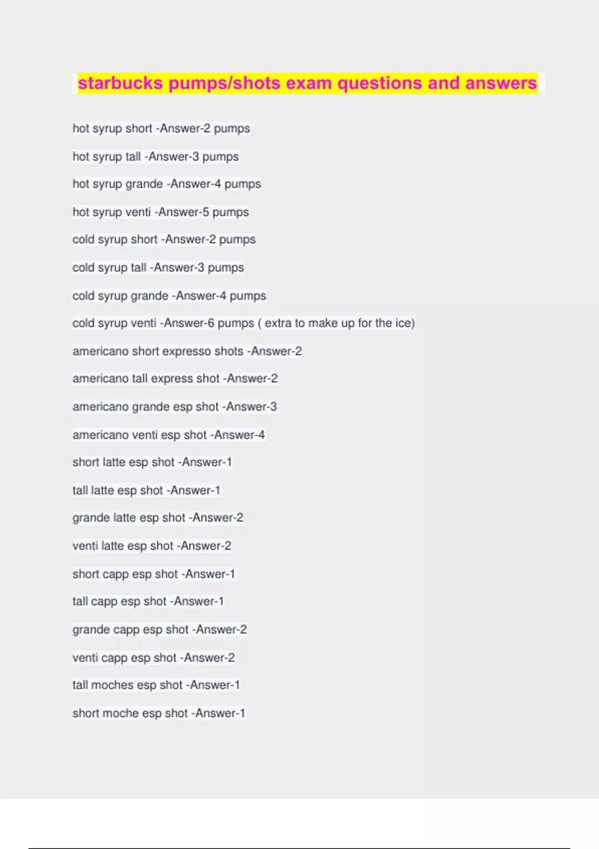 starbucks pumps/shots exam questions and answers