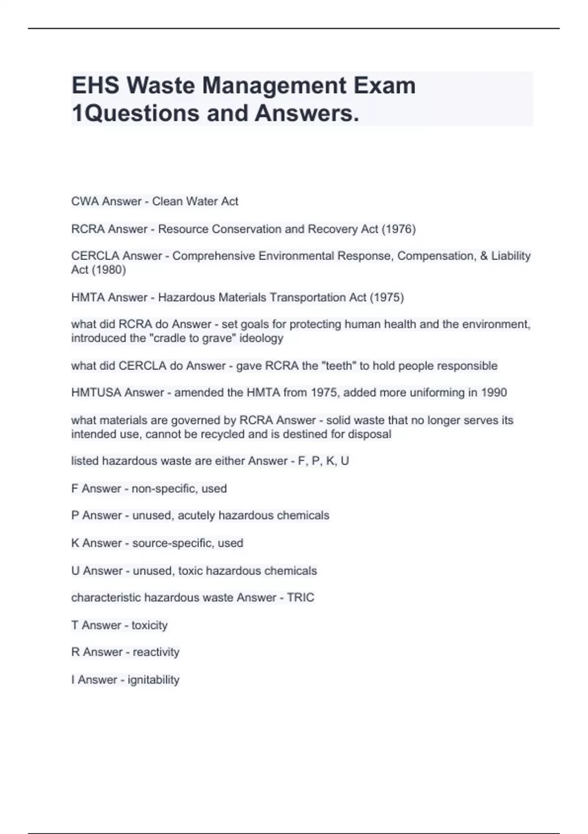 EHS Waste Management Exam 1Questions and Answers