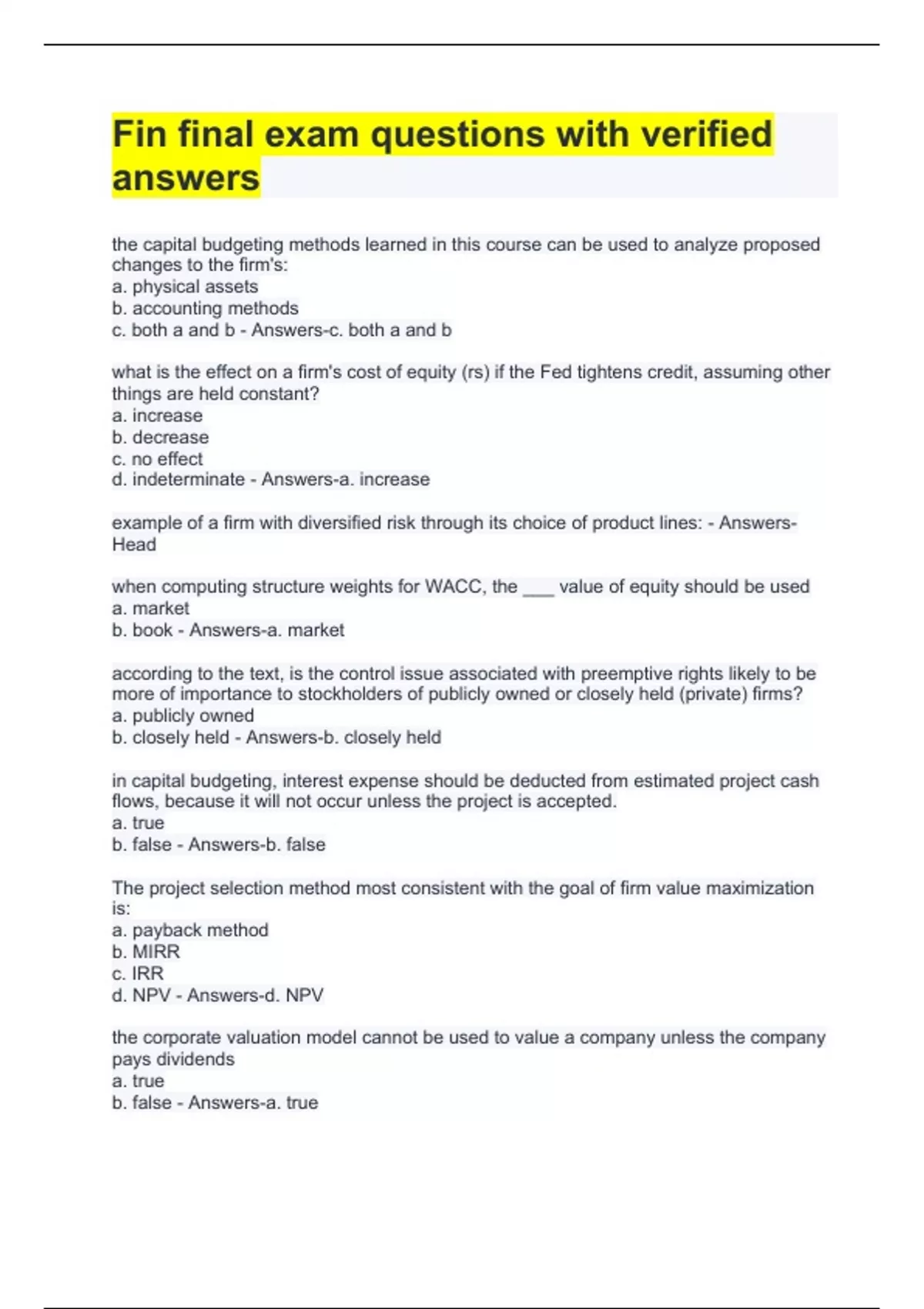 fin final exam questions with verified answers