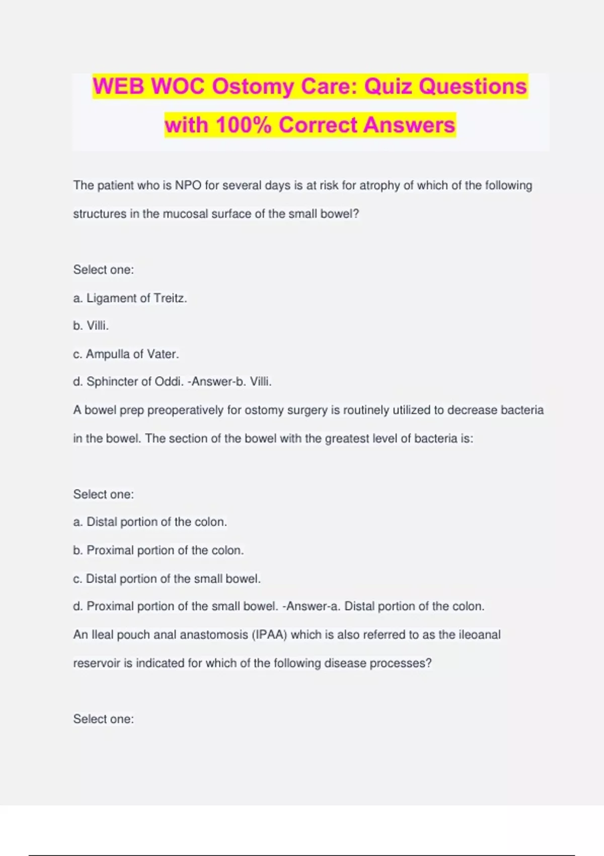 WEB WOC Ostomy Care: Quiz Questions with 100% Correct Answers The patient who is NPO for several days is at risk for atrophy of which of the following structures in the mucosal surface of the small bowel? Select one: a. Ligament of Treitz. b. Villi. c. Ampulla of Vater. d. Sphincter of Oddi. -Answer-b. Villi. A bowel prep preoperatively for ostomy surgery is routinely utilized to decrease bacteria in the bowel. The section of the bowel with the greatest level of bacteria is: Select one: a. Distal portion of the colon. b. Proximal portion of the colon. c. Distal portion of the small bowel. d. Proximal portion of the small bowel. -Answer-a. Distal portion of the colon. An Ileal pouch anal anastomosis (IPAA) which is also referred to as the ileoanal reservoir is indicated for which of the following disease processes? Select one: a. Irritable bowel syndrome and Crohn's Disease. b. Colorectal cancer and chronic ulcerative colitis. c. Crohn's Disease and chronic ulcerative colitis. d. Ulcerative colitis and familial adenomatous polyposis. -Answer-d. Ulcerative colitis and familial adenomatous polyposis. The preferred abdominal location for an ileostomy in the adult is the: Select one: a. LLQ. b. LUQ. c. RLQ. d. RUQ. -Answer-c. RLQ. Gary is experiencing a recurrence of his Crohn's Disease. Which of the following symptoms is Gary most likely experiencing? Select one: a. Obstructive abdominal pain. b. Absence of perianal disease. c. Bloody stools with proctitis. d. Vomiting. -Answer-a. Obstructive abdominal pain. The patient with ulcerative colitis will commonly exhibit: Select one: a. Oral ulcerations. b. Significant abdominal pain. c. Superficial mucosal involvement. d. Fistula formation. -Answer-c. Superficial mucosal involvement. When you read in the postoperative surgical report that the stoma was primarily matured, you can expect which of the following? Select one: a. The stoma will be opened at the bedside with electrocautery. b. The stoma has been present for at least 3 months. c. The stoma is ready for sutures at the mucocutaneous junction to be removed. d. The bowel was everted and sutured to the dermal surface during surgery. -Answer-d. The bowel was everted and sutured to the dermal surface during surgery. Which of the following groups of medications is used in the medical management of Crohn's disease? Select one: a. Corticosteroids and immune suppressants. b. Anticholinergics and anti-emetics. c. Antidepressants and antibiotics. d. Immune suppressants and antidepressants. -Answer-a. Corticosteroids and immune suppressants. Which of the following statements about Crohn's disease and/or ulcerative colitis is true? Select one: a. Both Crohn's Disease and ulcerative colitis are characterized by patchy mucosal involvement and skip lesions. b. Crohn's Disease is limited to the colon and rectum. c. Ulcerative colitis is characterized by transmural involvement of the bowel wall. d. Ulcerative colitis begins in the rectal area and progresses backward toward the ileocecal valve. -Answer-d. Ulcerative colitis begins in the rectal area and progresses backward toward the ileocecal valve. You are consulted to see a patient who has just been diagnosed with low rectal cancer located distal to the dentate line. You will prepare teaching materials to cover content areas related to which of the following surgical procedures? Select one: a. Low anterior resection (LAR). b. Abdominoperineal resection (APR). c. Total proctocolectomy (TPC). d. Ileal Pouch Anal Anastomosis (IPAA or IAR). -Answer-b. Abdominoperineal resection (APR). Pneumatosis is a radiologic finding associated with: Select one: a. Hirschsprung's disease. b. Gut Malrotation. c. Diverticulitis. d. Necrotizing Enterocolitis (NEC). -Answer-d. Necrotizing Enterocolitis (NEC). When preparing a 35-year-old male for colon resection with a temporary ileostomy due to refractory Crohn's disease, he asks about sexual function after surgery. You explain that this procedure involves: Select one: a. Removal of the rectum only. b. Moderate incidence of premature ejaculation. c. Do not anticipate any sexual dysfunction. d. High incidence of erectile dysfunction. -Answer-c. Do not anticipate any sexual dysfunction. You receive a referral for a patient schedu
