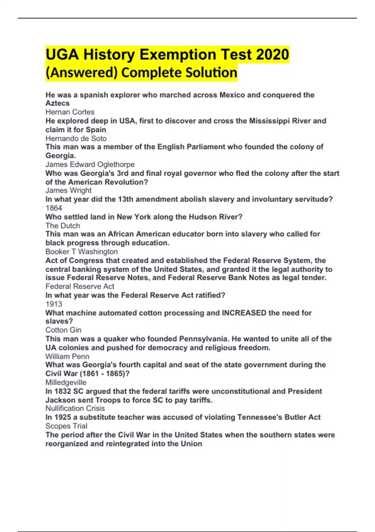 UGA History Exemption Test 2020 (Answered) Complete Solution He was a spanish explorer who marched across Mexico and conquered the Aztecs Hernan Cortes He explored deep in USA, first to discover and cross the Mississippi River and claim it for Spain Hernando de Soto This man was a member of the English Parliament who founded the colony of Georgia. James Edward Oglethorpe Who was Georgia's 3rd and final royal governor who fled the colony after the start of the American Revolution? James Wright In what year did the 13th amendment abolish slavery and involuntary servitude? 1864 Who settled land in New York along the Hudson River? The Dutch This man was an African American educator born into slavery who called for black progress through education. Booker T Washington Act of Congress that created and established the Federal Reserve System, the central banking system of the United States, and granted it the legal authority to issue Federal Reserve Notes, and Federal Reserve Bank Notes as legal tender. Federal Reserve Act In what year was the Federal Reserve Act ratified? 1913 What machine automated cotton processing and INCREASED the need for slaves? Cotton Gin This man was a quaker who founded Pennsylvania. He wanted to unite all of the UA colonies and pushed for democracy and religious freedom. William Penn What was Georgia's fourth capital and seat of the state government during the Civil War ()? Milledgeville In 1832 SC argued that the federal tariffs were unconstitutional and President Jackson sent Troops to force SC to pay tariffs. Nullification Crisis In 1925 a substitute teacher was accused of violating Tennessee's Butler Act Scopes Trial The period after the Civil War in the United States when the southern states were reorganized and reintegrated into the Union Reconstruction Era In what years did the Reconstruction Era occur? A series of economic programs enacted in the United States between 1933 and 1936. They involved presidential executive orders or laws passed by Congress during the first term of President Franklin D. Roosevelt. The New Deal Between what years was The New Deal enacted? An African American social reformer, orator, writer and statesman. Former Slave who was the leader of the abolitionist movement and supported women's suffrage. Frederick Douglass What organization unsuccessfully campaigned for an equal rights amendment to the constitution? National Organization of Women Who was the 40th President of the United States who worked to lift govt regulations, reduce taxes, and reduce domestic spending by curtailing social welfare. Launched the largest peacetime military buildup in American history. Ronald Reagan In what years did prohibition take place? A national ban on the sale, manufacture, and transportation of alcohol. American Prohibition Prohibition ended with the ratification of which amendment? The 21st Amendment Grayish bug that lays its eggs in cotton bolls destroying the cotton Boll Weevil This was a house committee on international security looking for alleged disloyalty and communist ties. Un-American Activities Committee A league of 5 tribes of indigenous people of North America involved in the Beaver Wars. Iroquois League In what year did the strike against Pearl Harbor take place? 1941 This strike against US by imperial Japanese navy that led the US into WW2. Also voided Roosevelt's neutrality act. Pearl Harbor Explicitly grants right of citizens to vote regardless of race, color or having been enslaved. 15th Amendment In what year was the 15th Amendment enacted? 1870 Poll taxes, literacy test, grandfather clause, property requirements aimed at disenfranchising black voters Voting Restrictions When did the civil war take place? War between the North and South US to determine the survival of union or independence of confederacy. Civil War This man was the father of the American revolution who inspired Rebels to declare independence from Britain and Wrote Common Sense and The American Crisis. Thomas Paine When was the American Federation of Labor founded? 1886 This is a collection of 85 articles and essays written by Alexander Hamilton, James Madison, and John Jay promoting the ratification of the United States Constitution-Against the bill of rights Federalist Papers When was the Sherman Antitrust Act passed? 1890 This law passed under the presidency of Benjamin Harrison prohibits certain business activities that Federal government deems to be anti-competitive.-monopolies and cartels Sherman Antitrust Act A social system that provides separate facilities for minority groups Segregation What effect did John Brown's raid on Harper's Ferry have on the United States? Both northern abolitionists and southern fire-eaters became incensed. This man was Vice President of Harding then finished his term when Harding died. He was reelected as the 30th President in 1924. Calvin Coolidge Landmark Supreme Court Case in 1857 which confirmed the status of slaves as property rather than citizens. Dred Scott vs. Sanford South surrendered at Appomattox court house End of the Civil War Supreme Court case which established the principle of judicial review 1803 Marbury vs. Madison What country claimed Quebec? France An American Baptist minister, activist, humanitarian, and leader in the African-American Civil Rights Movement. Promoted nonviolent civil disobedience. Martin Luther King, Jr. In what year did MLK win the Nobel Peace Prize? 1964 Considered "Father of the Constitution" because of his role in its writing and ratification. Wrote Bill of Rights. One of the authors of the Federalist Papers. James Madison Who was president during the war of 1812? James Madison An armed conflict between American Indian inhabitants of New England versus the New England colonists and their Indian allies. King Phillip's War When did King Philip's War take place? Who was the VP of Confederate states of America during civil war? Alexander Stephens In what year did King George II issue the offic