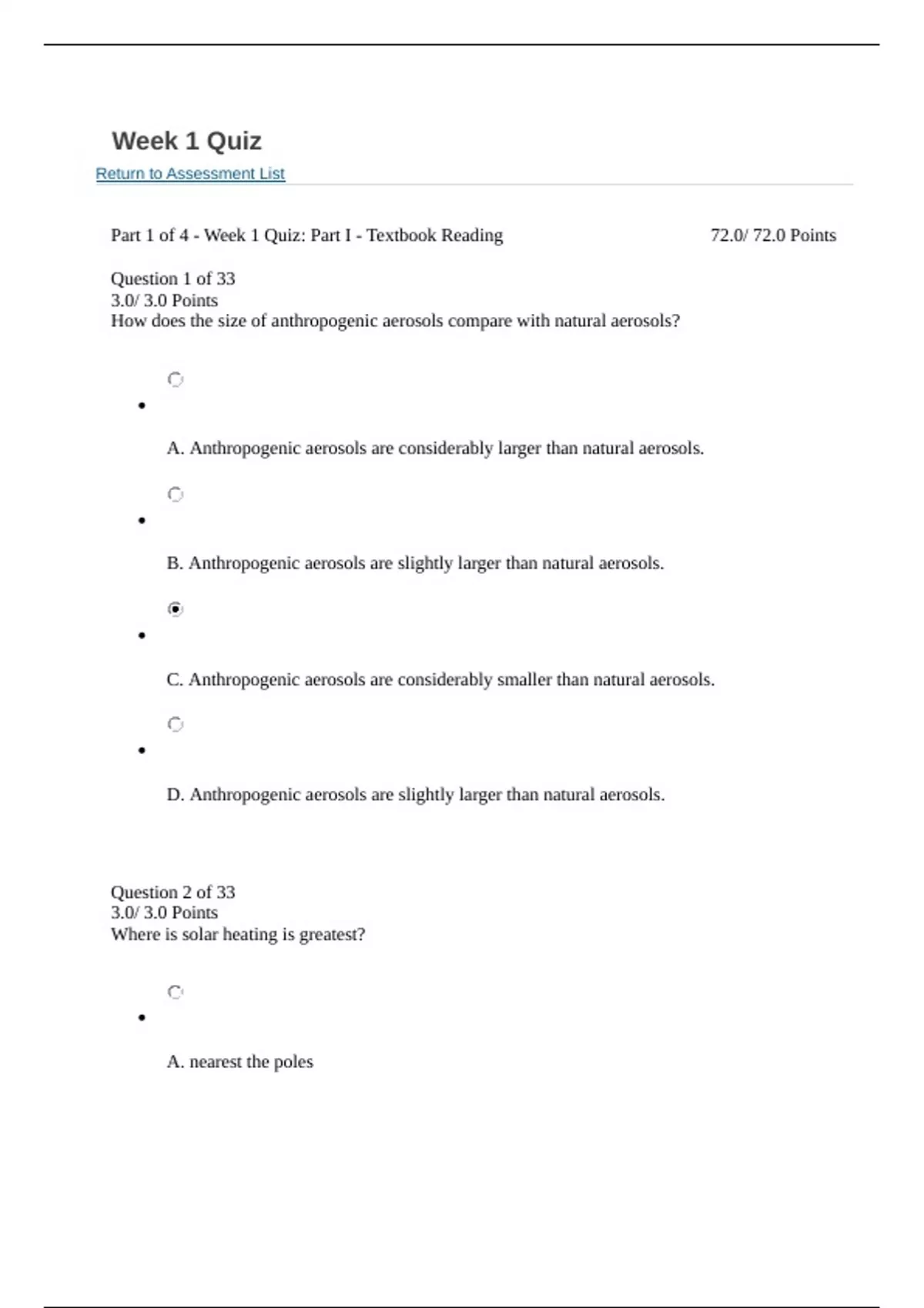 Week 1 Quiz Return to Assessment List Part 1 of 4 - Week 1 Quiz: Part I - Textbook Reading 72.0/ 72.0 Points Question 1 of 33 3.0/ 3.0 Points How does the size of anthropogenic aerosols compare with natural aerosols? A. Anthropogenic aerosols are considerably larger than natural aerosols. B. Anthropogenic aerosols are slightly larger than natural aerosols. C. Anthropogenic aerosols are considerably smaller than natural aerosols. D. Anthropogenic aerosols are slightly larger than natural aerosols. Question 2 of 33 3.0/ 3.0 Points Where is solar heating is greatest? A. nearest the poles B. nearest the equator C. in the middle latitudes D. in high latitudes Question 3 of 33 3.0/ 3.0 Points What instrument is used to measure temperature? A. thermometer B. hair hygrograph C. barometer D. anemometer