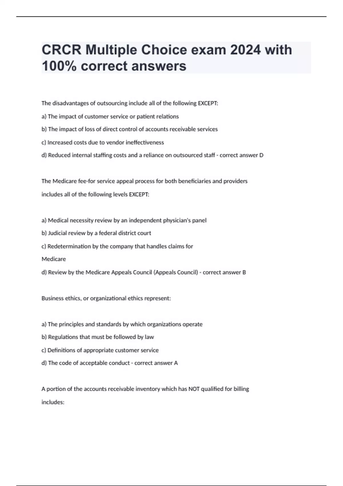 The disadvantages of outsourcing include all of the following EXCEPT: a) The impact of customer service or patient relations b) The impact of loss of direct control of accounts receivable services c) Increased costs due to vendor ineffectiveness d) Reduced internal staffing costs and a reliance on outsourced staff - correct answer D The Medicare fee-for service appeal process for both beneficiaries and providers includes all of the following levels EXCEPT:
