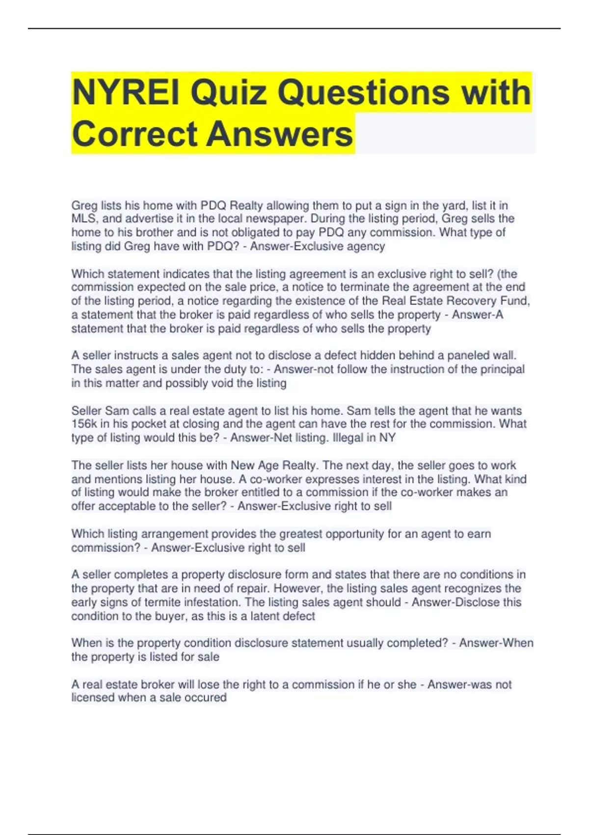NYREI Quiz Questions with Correct Answers Greg lists his home with PDQ Realty allowing them to put a sign in the yard, list it in MLS, and advertise it in the local newspaper. During the listing period, Greg sells the home to his brother and is not obligated to pay PDQ any commission. What type of listing did Greg have with PDQ? - Answer-Exclusive agency Which statement indicates that the listing agreement is an exclusive right to sell? (the commission expected on the sale price, a notice to terminate the agreement at the end of the listing period, a notice regarding the existence of the Real Estate Recovery Fund, a statement that the broker is paid regardless of who sells the property - Answer-A statement that the broker is paid regardless of who sells the property A seller instructs a sales agent not to disclose a defect hidden behind a paneled wall. The sales agent is under the duty to: - Answer-not follow the instruction of the principal in this matter and possibly void the listing Seller Sam calls a real estate agent to list his home. Sam tells the agent that he wants 156k in his pocket at closing and the agent can have the rest for the commission. What type of listing would this be? - Answer-Net listing. Illegal in NY The seller lists her house with New Age Realty. The next day, the seller goes to work and mentions listing her house. A co-worker expresses interest in the listing. What kind of listing would make the broker entitled to a commission if the co-worker makes an offer acceptable to the seller? - Answer-Exclusive right to sell Which listing arrangement provides the greatest opportunity for an agent to earn commission? - Answer-Exclusive right to sell A seller completes a property disclosure form and states that there are no conditions in the property that are in need of repair. However, the listing sales agent recognizes the early signs of termite infestation. The listing sales agent should - Answer-Disclose this condition to the buyer, as this is a latent defect When is the property condition disclosure statement usually completed? - Answer-When the property is listed for sale A real estate broker will lose the right to a commission if he or she - Answer-was not licensed when a sale occured Which statement about NY's Property Condition Disclosure Statement is true? (A buyer must receive a copy of the disclosure before signing a sales contract, only visible structural defects need to be disclosed, the seller has a duty to disclose death by natural causes, sellers of condominiums must provide the disclosure to a buyer) - Answer-A buyer must receive a copy of the disclosure before signing a sales contract A real estate broker acting as a seller's agent may (advise the seller of the best manner of taking title to the new property they are purchasing, attempt to create or encourage an offer from another buyer, disclose to a buyer that the client will accept a offer at the listed price and terms, modify the listing contract on behalf of the seller if it is in the seller's best interest) - Answer-A broker actin gas an agent of the seller is required to use his or her best effort to market the property and locate a ready, willing, and able purchaser. Attempt to create or encourage an offer. A condition or contingency in a contract can be waived by the - Answer-party benefiting from the condition Salesperson Sue has just completed a pre-printed purchase agreement with her client buyer Bob. The agreement includes a good faith deposit of 5k in the form of a check, which Bob has give to Sue. Absent any specific instructions, what should Sue do with Bob's check? - Answer-Turn it over to her broker immediately Real estate fees or commissions are (determined by local board or association, mandated by the state's rules and regs, mandated by statutory law, negotiated between the client and broker) - Answer-negotiated between the broker and client All four of the real estate licensees who work for Joe Wilson, owner of Wilson Realty, have passed the NY real estate broker's exam. How many licenses must be hanging on the wall at Wilson Realty? - Answer-1 Great Resorts realty is offering the chance to enter a drawing for a free weekend at a timeshare in the Catskills. Their advertising must contain... - Answer-Great Resorts cannot promote real estate with a game of chance Which statement about a brokerage's main office is false (it must have a sign that clearly identifies it as a real estate business, it must have a supervising broker, it may be a virtual office with a PO box, it amy have an unlimited number of branch offices) - Answer-It may be a virtual office. The main office MUST be a actual, physical location Louise, the owner of LKR realty, has three salespeople working for her brokerage. She has little time to supervise, but she is confident in their ability. Can she draft a contract that clear states that she is no longer responsible for any errors or omissions that her salespeople make? - Answer-No Who does not require a real estate license? - Answer-A person who buys and sells houses as FSBOs (for sale by owner) Can a person advertise their business under any name other than their own? - AnswerNo, all advertising must be under the exact name under which the brokerage is licensed. What is the term of office for an appointed member of the State Board of Real Estate - Answer-Two years Who cannot be a member of the state board of real estate? Someone who has been a licensed real estate salesperson for 10 years, executive director of the consumer protection board, a member of the general public, the secretary of state - Answer-a person with a real estate license for 10+ years Can a person with a real estate license work for two different brokers in different parts of the state? - Answer-Yes. They cannot hire other salespeople or supervise a branch office. Karen is found guilty of practicing real estate without a license. If this is her third offense, what is the max penalty that the DOS c