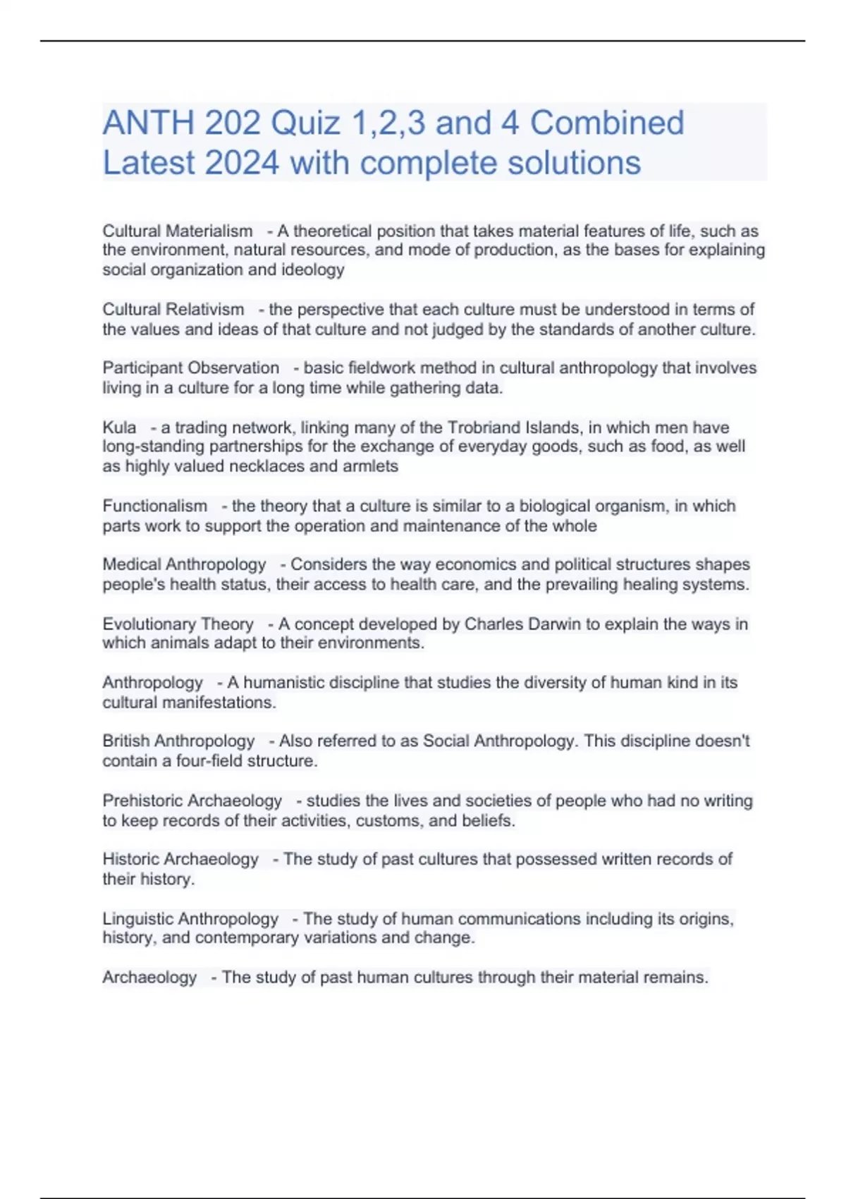 ANTH 202 Quiz 1,2,3 and 4 Combined Latest 2024 with complete solutions