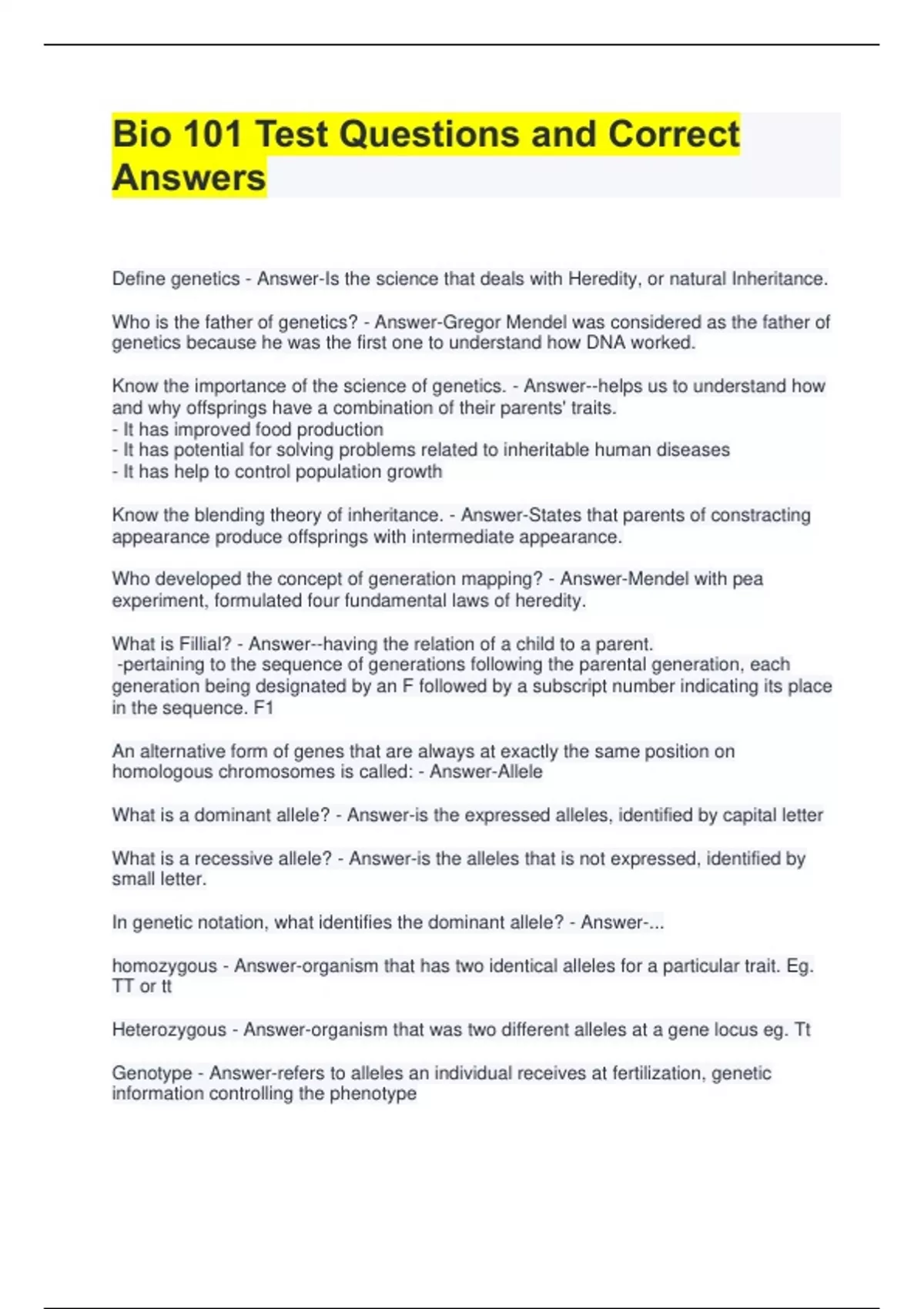 Bio 101 Test Questions and Correct Answers Define genetics - Answer-Is the science that deals with Heredity, or natural Inheritance. Who is the father of genetics? - Answer-Gregor Mendel was considered as the father of genetics because he was the first one to understand how DNA worked. Know the importance of the science of genetics. - Answer--helps us to understand how and why offsprings have a combination of their parents' traits. - It has improved food production - It has potential for solving problems related to inheritable human diseases - It has help to control population growth Know the blending theory of inheritance. - Answer-States that parents of constracting appearance produce offsprings with intermediate appearance. Who developed the concept of generation mapping? - Answer-Mendel with pea experiment, formulated four fundamental laws of heredity. What is Fillial? - Answer--having the relation of a child to a parent. -pertaining to the sequence of generations following the parental generation, each generation being designated by an F followed by a subscript number indicating its place in the sequence. F1 An alternative form of genes that are always at exactly the same position on homologous chromosomes is called: - Answer-Allele What is a dominant allele? - Answer-is the expressed alleles, identified by capital letter What is a recessive allele? - Answer-is the alleles that is not expressed, identified by small letter.